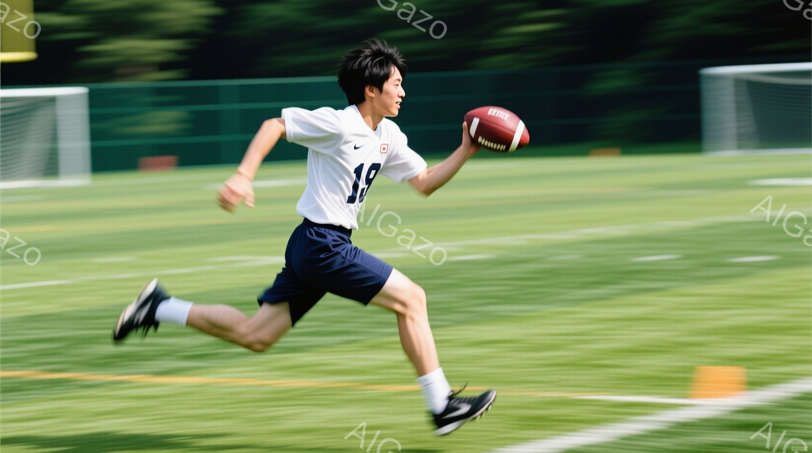 少年は緑の芝生の上を走り、片手にアメリカンフットボールを持っている。彼は白いTシャツと黒いショーツ、そして白い靴下とスニーカーを着用しており、髪は短く、表情は真剣で集中している。背景には緑豊かな木々が見え、晴れた日の屋外でスポーツを楽しんでいる様子がうかがえる。