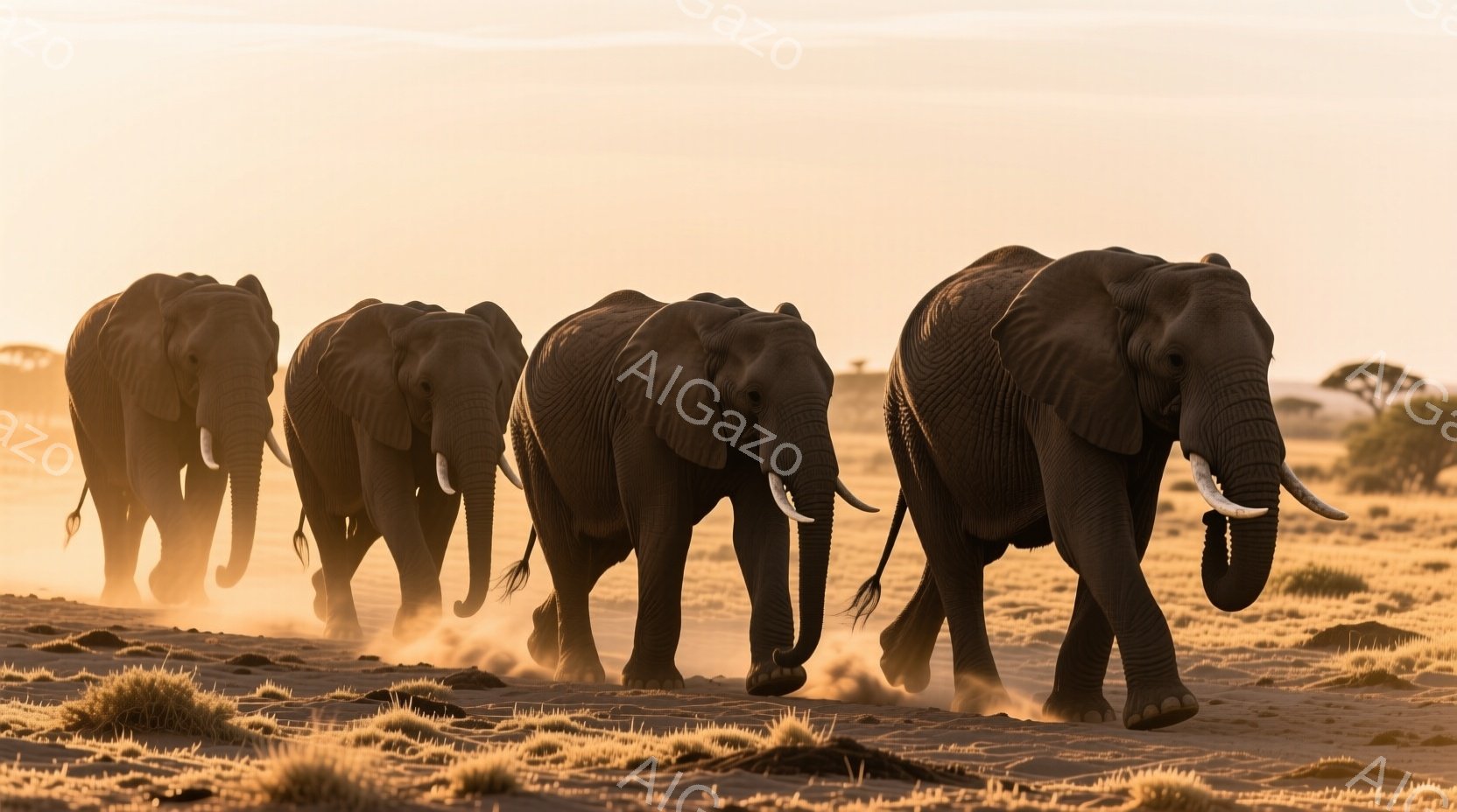 砂漠のような平原を、一列に並んだアフリカゾウが歩いている様子が捉えられている。夕焼けの光が埃っぽい地面を照らし、ゾウのシルエットを強調し、温かく力強い雰囲気を生み出している。遠くには低い草が生い茂り、背景は霞んでおり、広大な自然の風景を暗示している。
