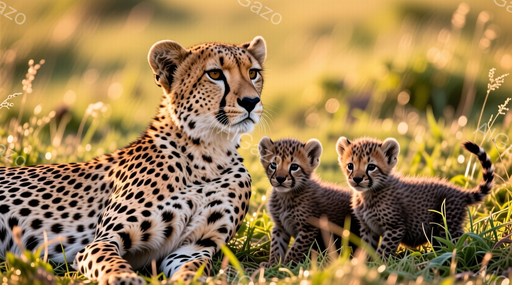 広大な緑の草原に、母チーターと子チーター2頭が寄り添って横たわっています。母チーターは警戒した表情で正面を見つめ、子チーターたちは好奇心旺盛な眼差しでカメラの方を見ています。背景は鮮やかな緑の草で覆われ、穏やかな光が差し込み、安らぎと生命力に満ちた雰囲気です。