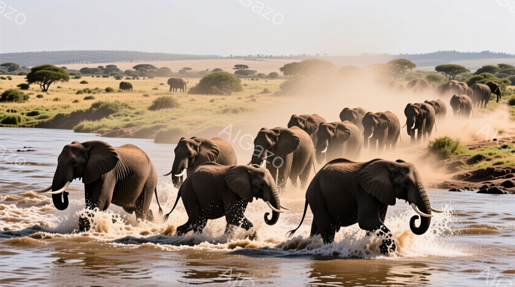 多数のゾウが浅い水辺を隊列をなして歩いている様子が写っている。水しぶきが上がり、ゾウたちは力強く前進しており、背景には黄金色のサバンナと点在する木々が広がり、夕暮れのような暖かい光に包まれている。この光景は、野生の力強さと自然の美しさを感じさせる。