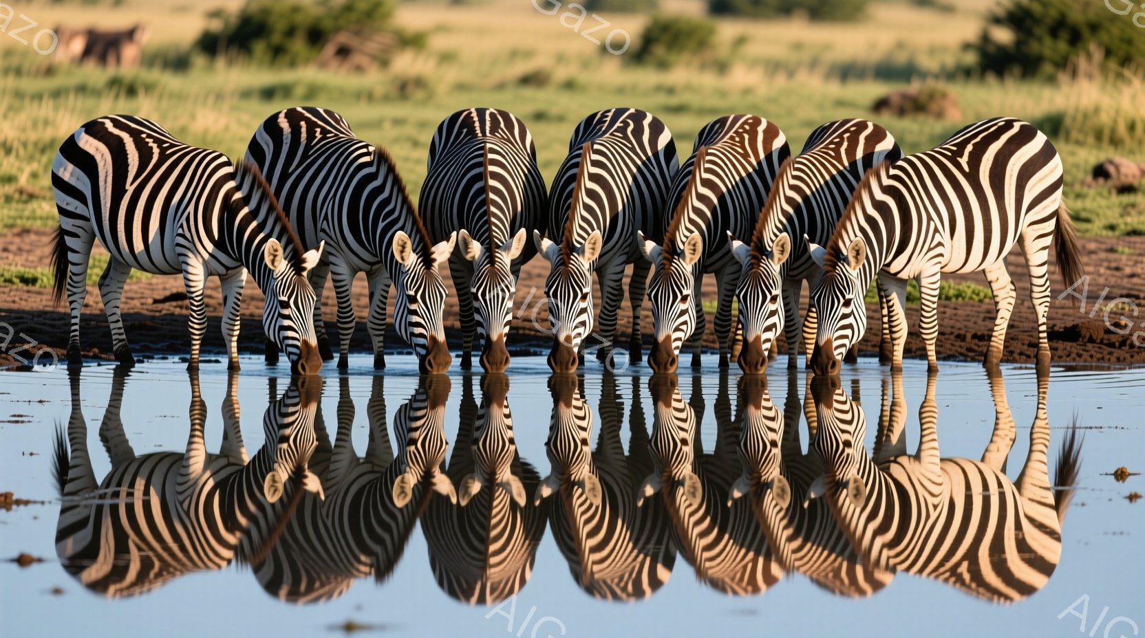 シマウマが水場で水を飲んでいる様子が写っている。シマウマたちは密集して水辺に集まり、水面に映る姿も確認できる。背景には乾いた草原が広がり、空は晴れ上がっていることから、乾燥した地域での暑い日の様子を表している。