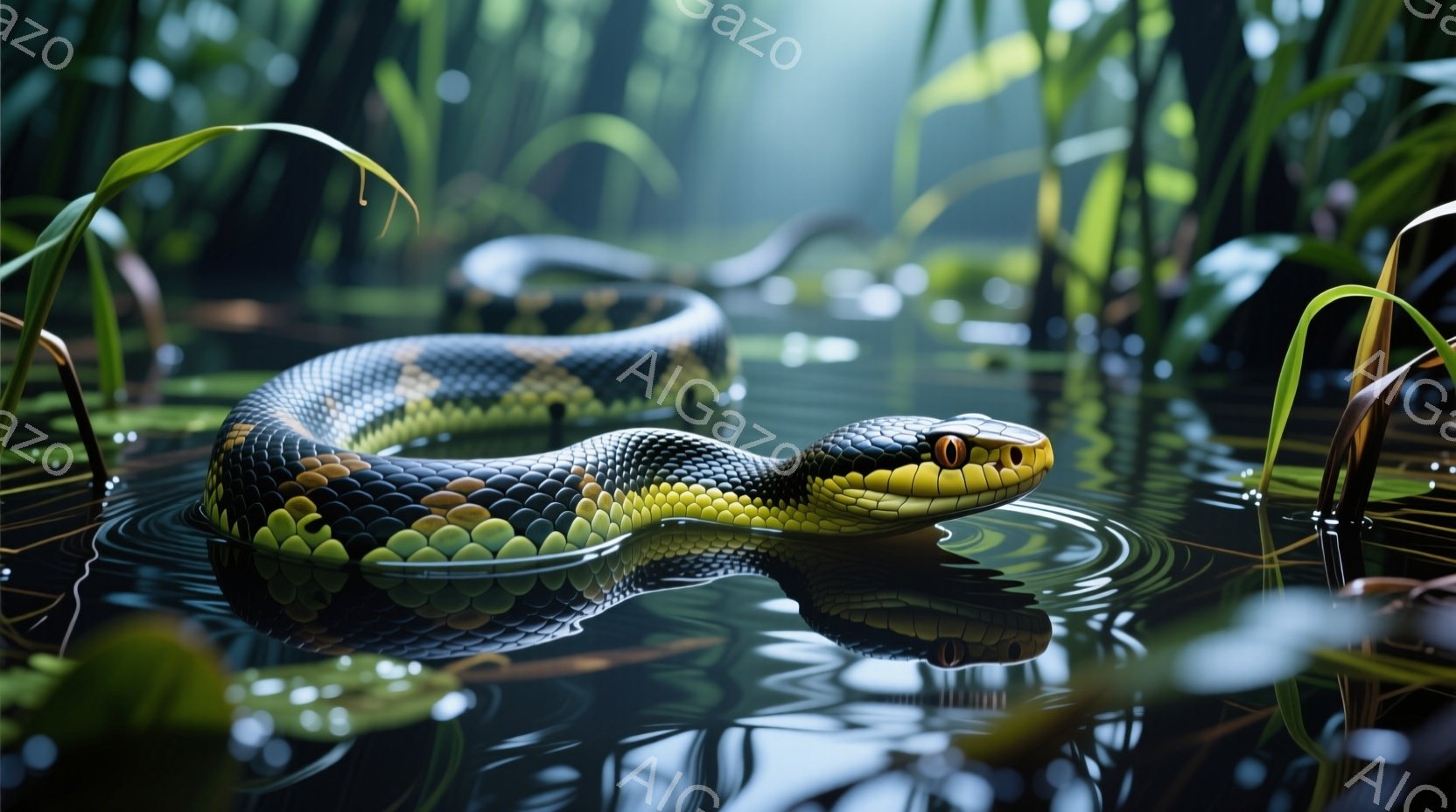 鮮やかな黄色と黒の縞模様を持つ巨大な蛇が、水面に浮かび、こちらを鋭い赤い目で睨んでいます。背景には緑豊かな植物が生い茂り、水面には蛇の姿が映り込み、静かで湿ったジャングルの雰囲気が漂います。蛇は緩やかに水面を滑るように進み、静かに獲物を狙っているような様子です。