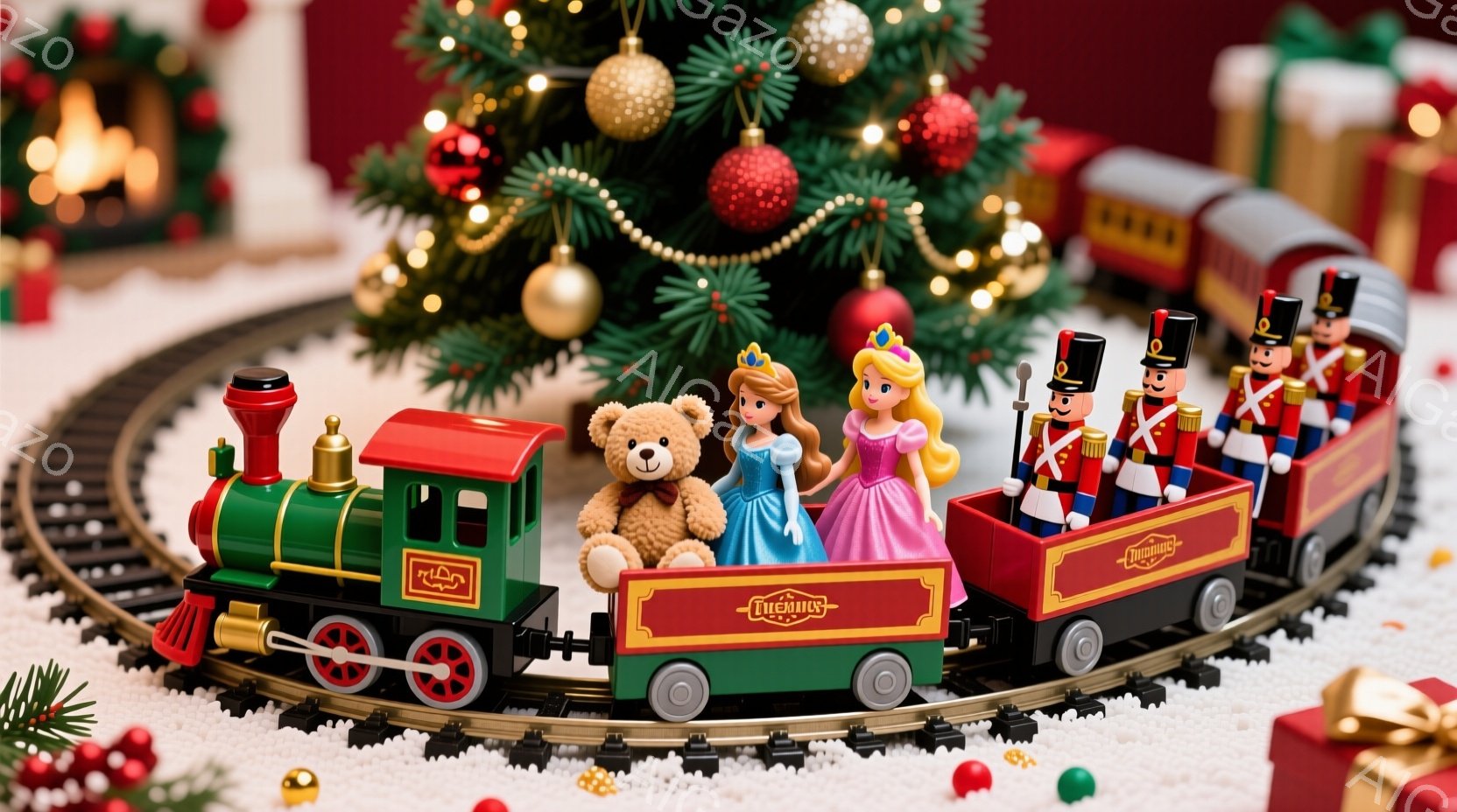 クリスマスツリーを背景に、おもちゃの列車が描かれている。列車は、テディベア、青いドレスを着た人形、そして兵隊の人形を乗せており、それぞれが列車に沿って座っている。背景には、ぼやけたクリスマスツリーとプレゼントボックスが見え、温かくお祝いの雰囲気を醸し出している。