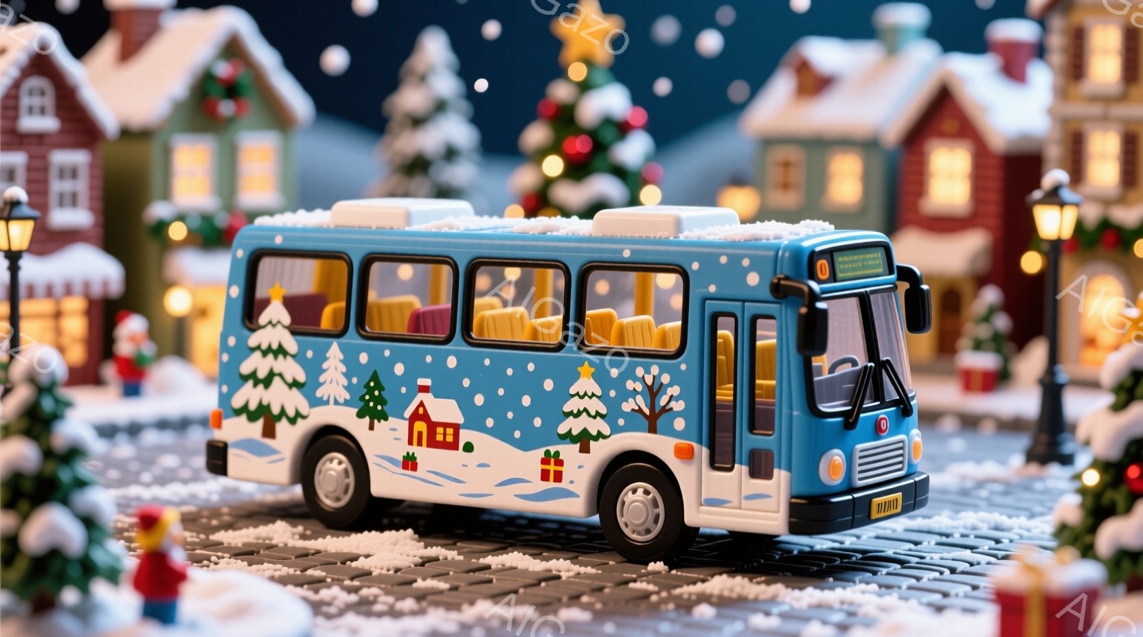 雪が降る夜のクリスマスタウンを、青いクリスマス柄のミニバスが走っている。背景には、雪化粧された屋根の可愛らしい家々が並び、クリスマスツリーが飾られている。ミニバスはホリデーシーズンを祝う、温かく、お祝いムードに満ちた雰囲気を作り出している。