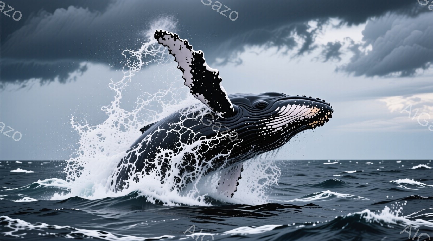 深い青色の海中で、大きなコククジラが水面から跳躍している様子が捉えられています。鯨は左側のヒレを空中に高く上げ、波しぶきを巻き上げながらダイナミックなポーズを取っています。背景は暗い雲に覆われ、荒れた海と合わせて、力強く、壮大な雰囲気を醸し出しています。
