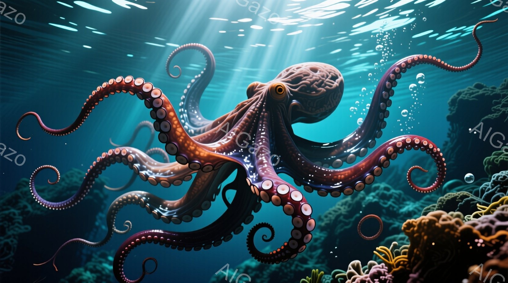 深い青色の海中に、鮮やかな赤褐色のタコが悠々と漂っている。タコの腕はねじれ、複雑に絡み合い、吸盤が密集して見える。背景には、様々な色のサンゴ礁が広がり、水中に光の筋が差し込み、幻想的な雰囲気を醸し出している。