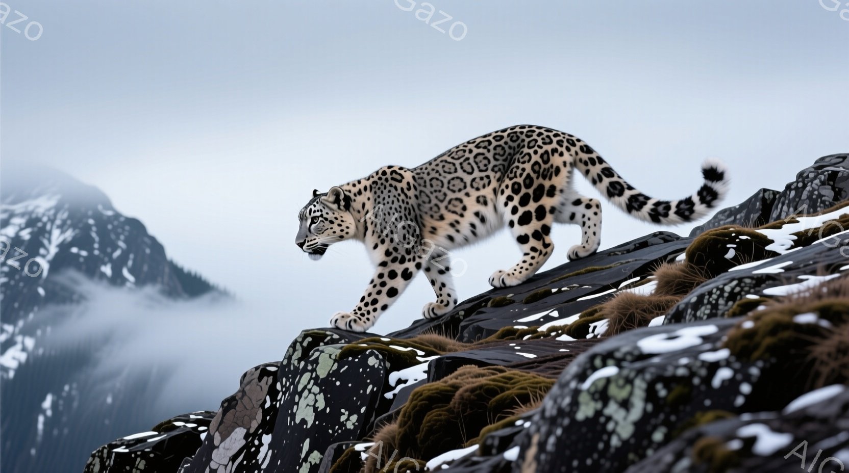 岩場に雪豹が佇んでおり、その毛並みは白地に黒い斑点が特徴的で、冬の厳しい環境に適応していることが伺えます。背景には雪を抱いた山々が霧に霞み、厳しくも神秘的な雰囲気を醸し出しています。岩肌には緑色の苔が点在し、豹の美しい毛色とのコントラストが際立っています。