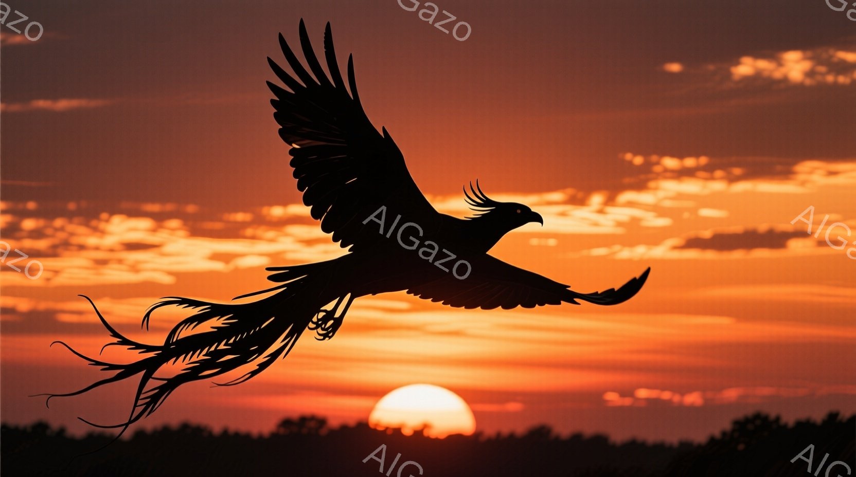 燃えるような夕焼けを背景に、シルエットの不死鳥が翼を広げて飛んでいる。その姿は力強く、まるで希望の象徴のように見える。地平線には太陽が沈みかけており、暗い木々のシルエットが広がっている。
