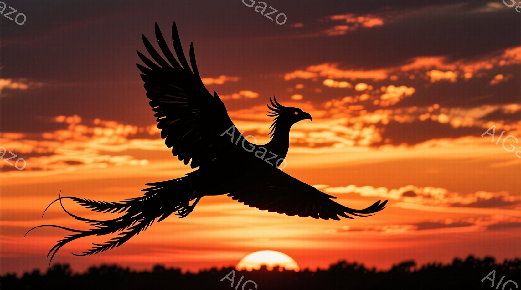 空は燃えるような夕焼けで、オレンジと赤色が混ざり合い、力強い印象を与えている。シルエットで描かれた鳥は翼を広げ、まるで太陽に向かって飛んでいるかのように見える。地平線には山の稜線が見え、全体的に壮大でドラマチックな雰囲気を醸し出している。