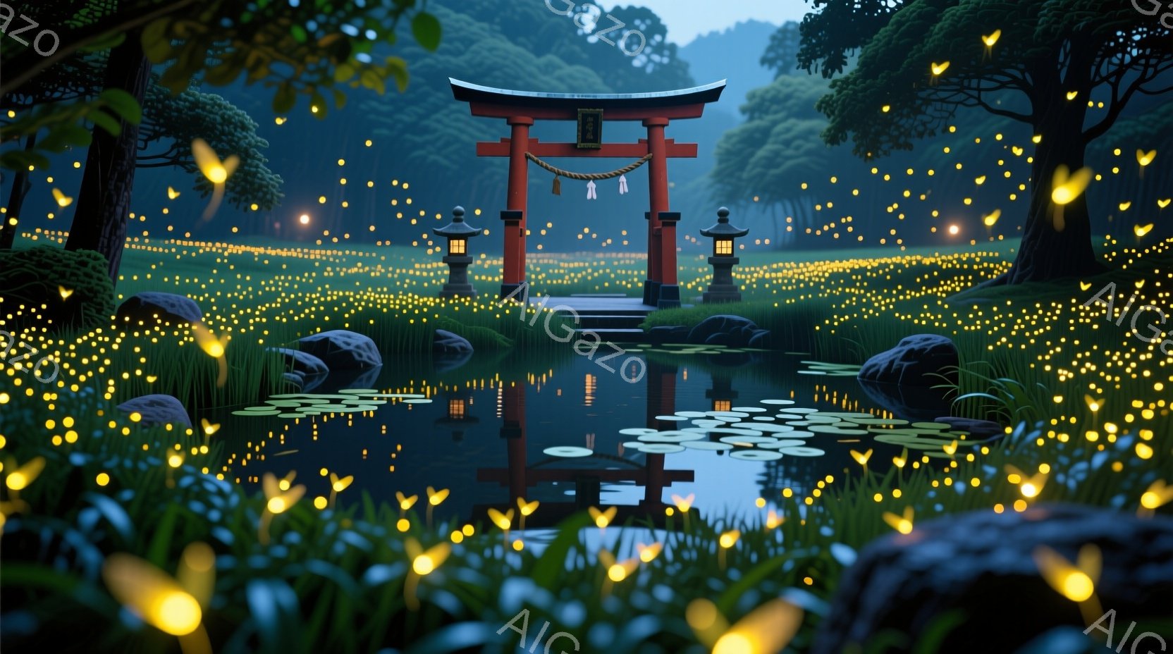 静かな池のほとりに赤い鳥居が佇み、周囲には無数の光るホタルが舞っている。水面には鳥居とホタルが映り込み、幻想的な雰囲気を醸し出している。緑豊かな木々が生い茂り、穏やかな夜の自然を感じさせる美しい光景である。