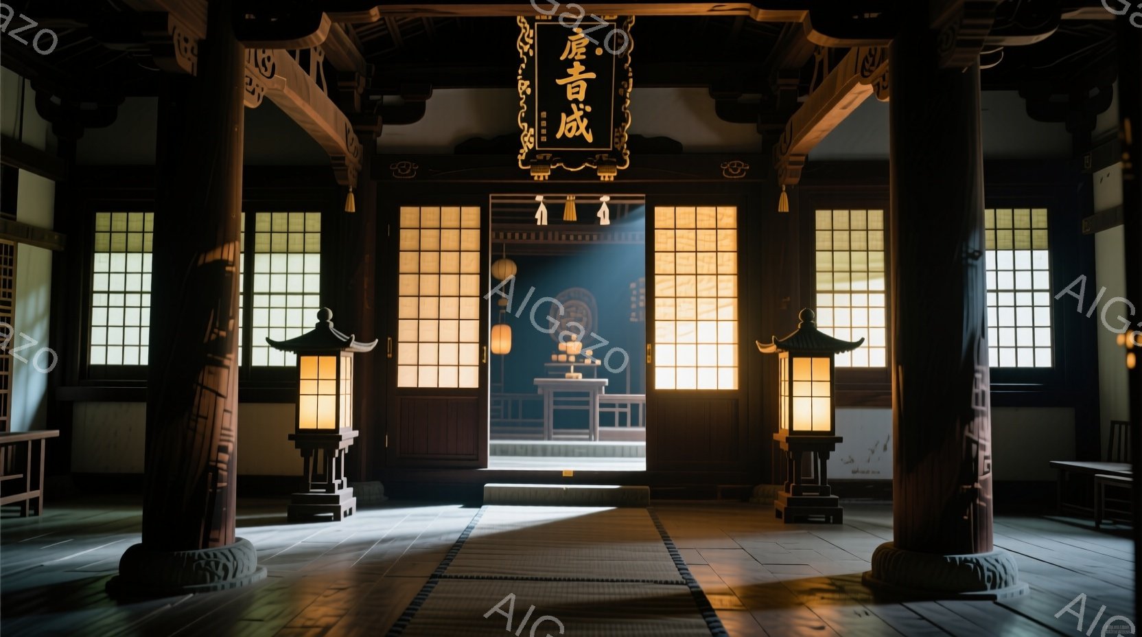 広大な寺院の内部で、畳敷きの床に光が差し込み、荘厳な雰囲気を醸し出している。奥には木製の祭壇が設置されており、静寂と神聖さが感じられる。柱や壁には精緻な彫刻が施されており、日本の伝統的な建築美が際立っている。