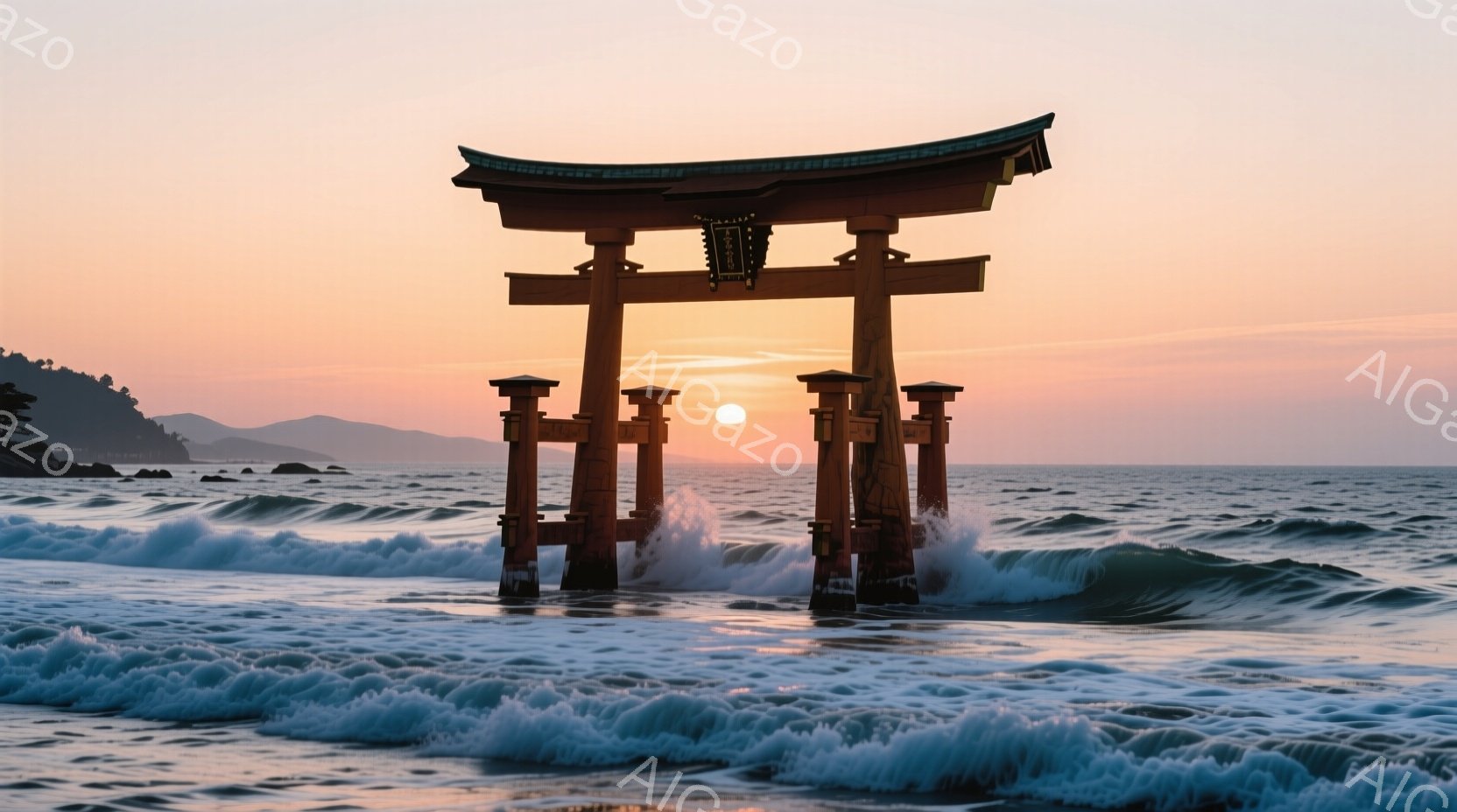海中に立つ朱色の鳥居が印象的な光景です。夕焼け空を背景に、波が鳥居の周りを囲み、神聖でありながら力強い雰囲気を醸し出しています。遠景には山々が見え、穏やかさと荘厳さが共存する、日本の風景を象徴する一枚です。