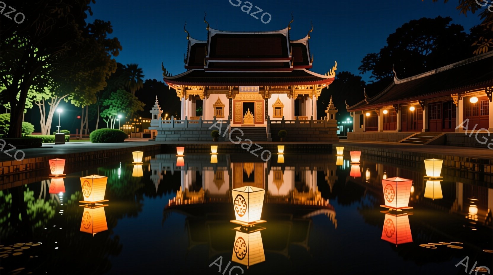 夜の寺院が水面に映り込み、幻想的な光景が広がっています。水面には提灯が浮かび、そのオレンジ色の光が水面に揺らめき、周囲の建物と木々を照らしています。寺院の複雑な装飾と水面の反射が組み合わさり、静かで神秘的な雰囲気を醸し出しています。