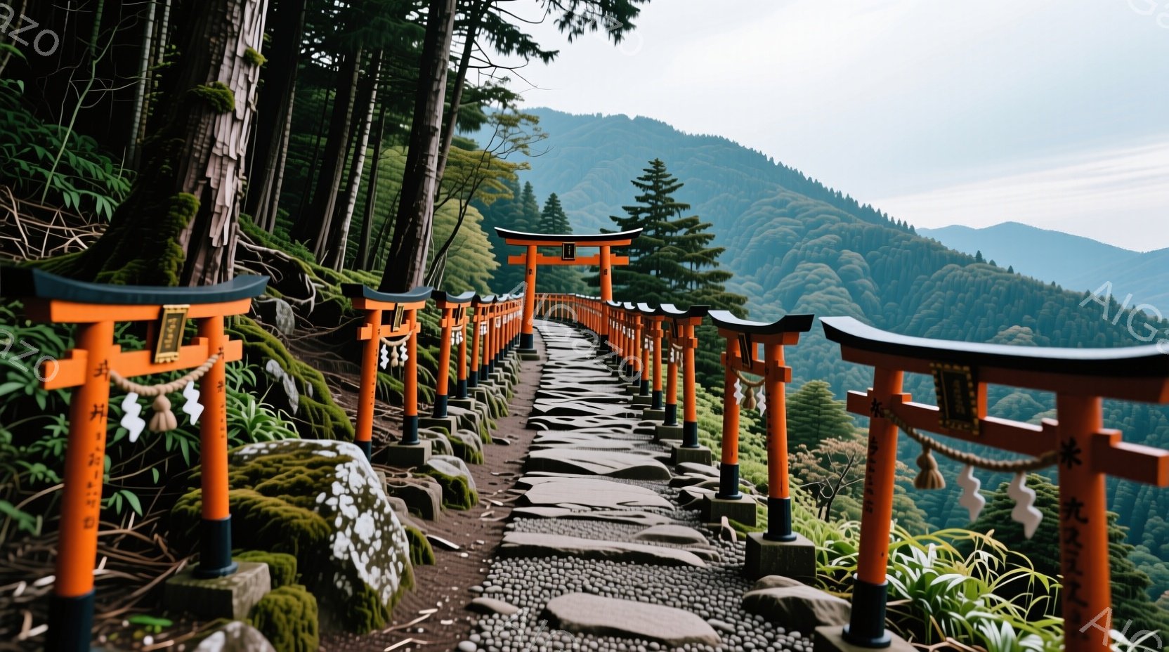 朱色の鳥居が連なる道が、緑豊かな山々へと続く風景です。鳥居には墨で書かれた文字が刻まれ、石灯籠が道の両脇に並んでいます。空は曇り空で、全体的に静かで神秘的な雰囲気が漂っています。
