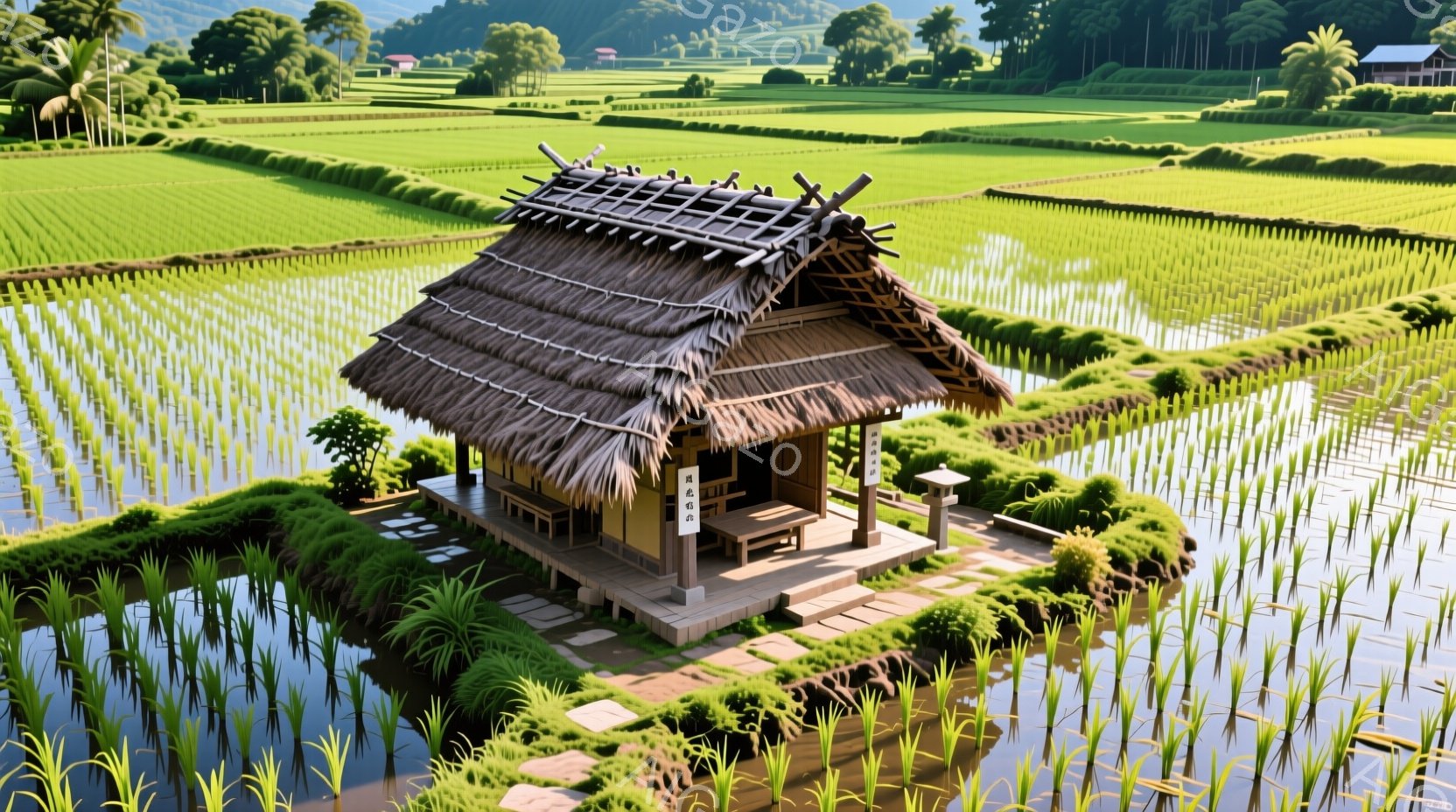 広大な水田の中に、茅葺屋根の小さな建物が浮かんでいます。周囲は緑豊かな水田で囲まれ、遠くには山々と建物が見えます。静かで穏やかな田園風景が印象的で、自然との調和が感じられます。