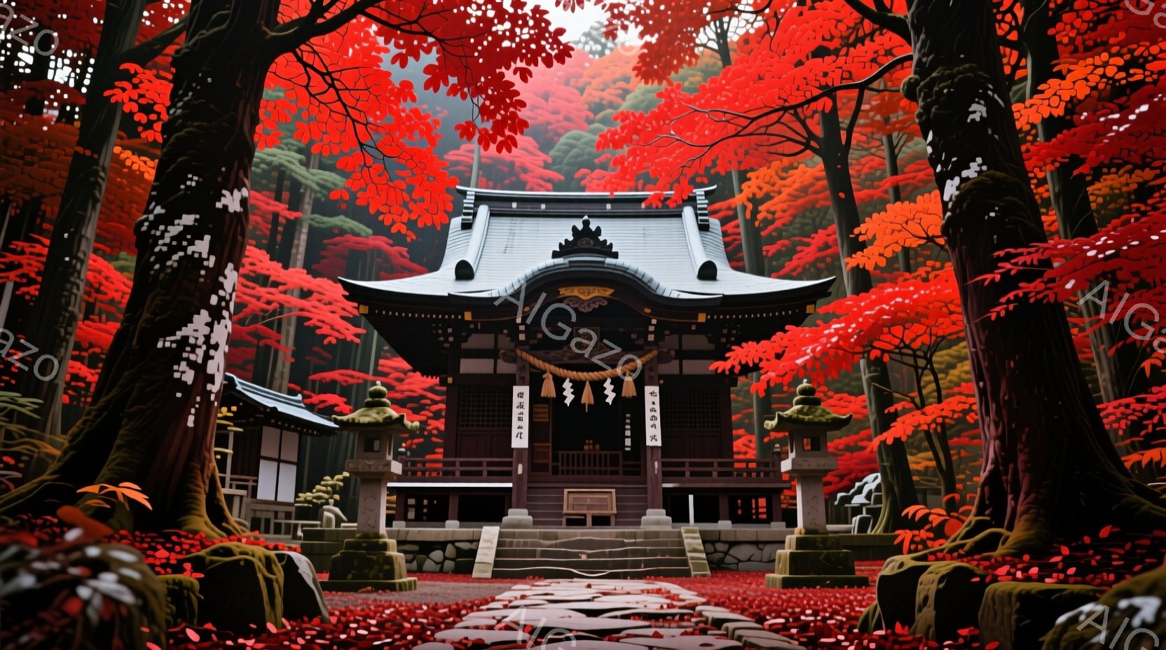 赤い紅葉に囲まれた神社が、石段を上がって見えます。神社の建築は伝統的な様式で、鮮やかな朱色と黒色が特徴的です。背景の木々が生い茂り、静寂で神秘的な雰囲気を醸し出しています。
