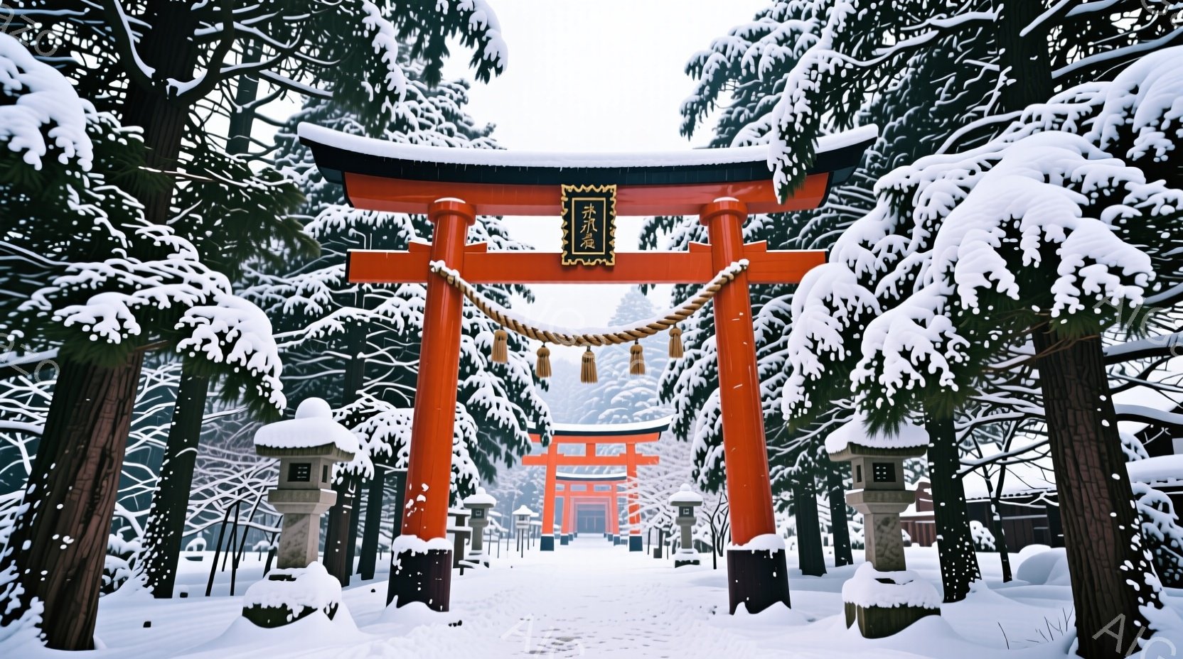 雪が降り積もる中、朱色の鳥居が連なる風景が広がっています。両脇には石灯籠が立ち並び、遠くにも鳥居が見えることから、神社の参道であることがわかります。雪景色と朱色のコントラストが美しく、静寂で神聖な雰囲気が漂っています。