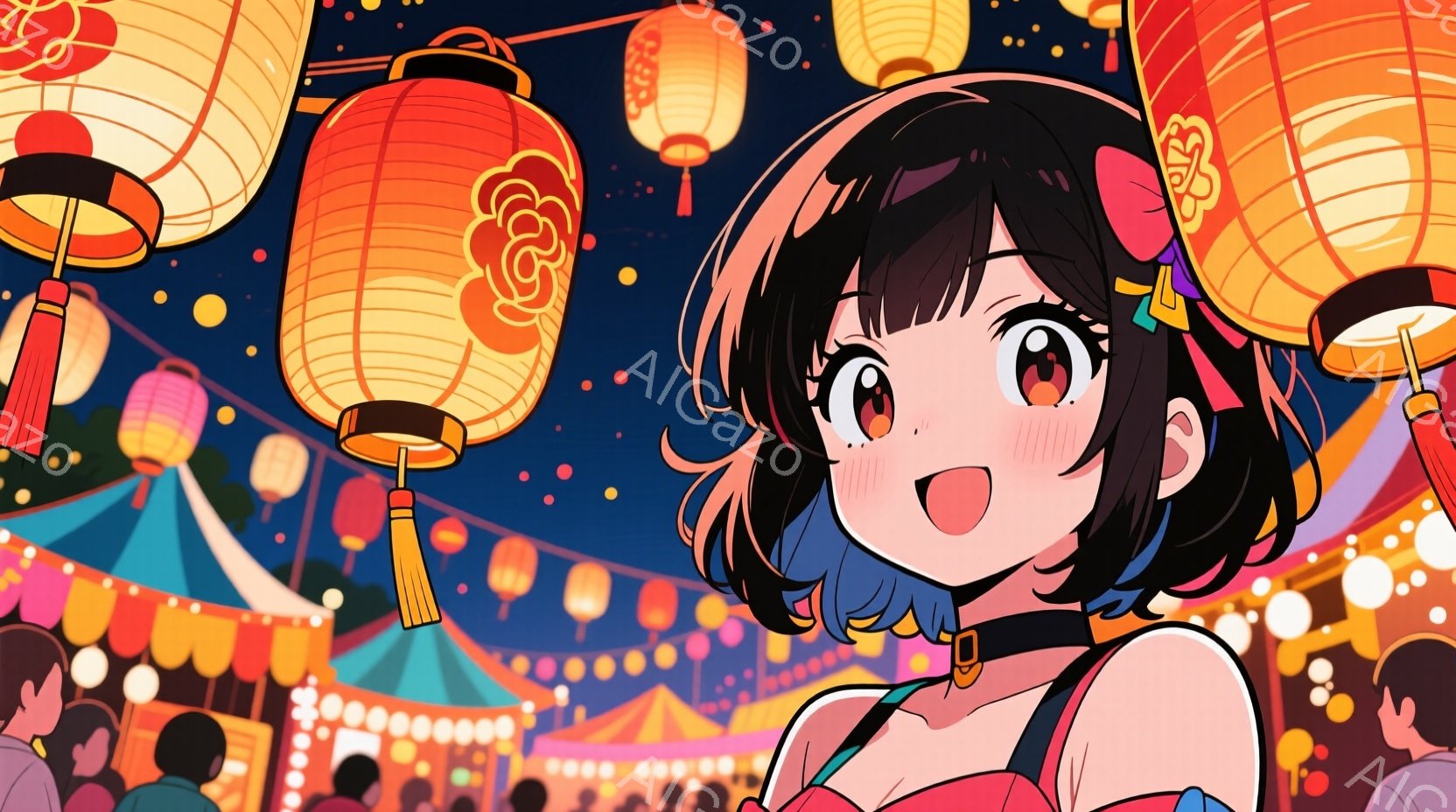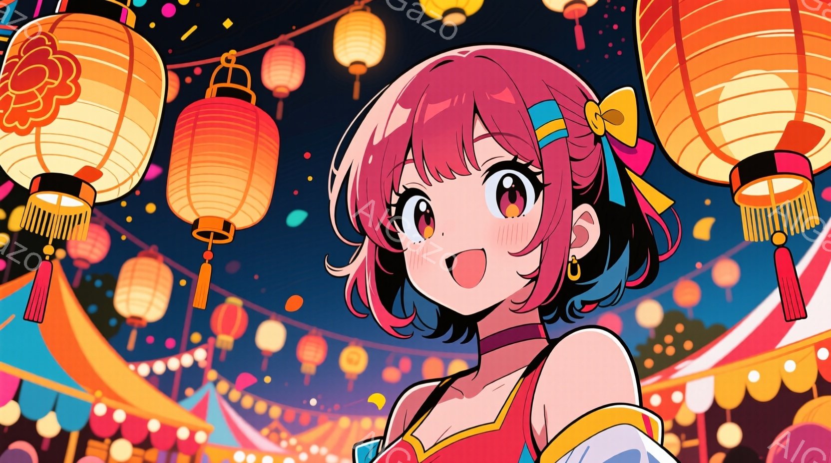 明るい笑顔を浮かべた少女が描かれています。彼女は肩出しの白い服に黄色いアクセントがあり、髪は茶色とピンクのグラデーションで、大きなリボンで飾られています。背景には提灯や屋台が並び、お祭りの賑やかな雰囲気が伝わってきます。