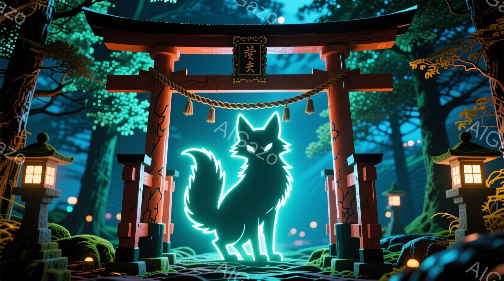 鮮やかな緑色の森の中に、朱色の鳥居がそびえ立っています。鳥居の前には、光り輝く白い狐が静かに立っており、その姿は神秘的で神々しい雰囲気を醸し出しています。 周囲には石灯籠が配置され、背景にはぼんやりと木々が見え、幻想的な空間を作り出しています。