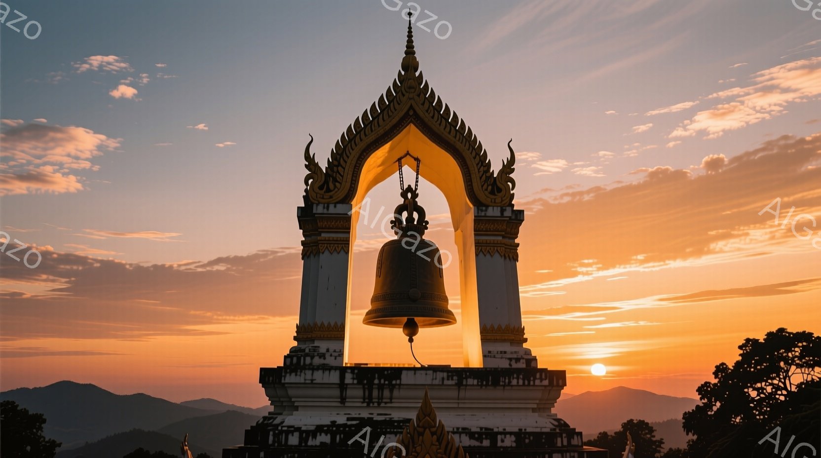 巨大な青銅の鐘が、精巧な装飾が施された白い石造りの塔の中に吊り下げられています。背景には、燃えるようなオレンジとピンクの色合いが広がる夕焼け空が広がり、荘厳な雰囲気を醸し出しています。塔は複雑な彫刻と装飾で覆われており、タイ様式の建築様式が強く印象づけられます。