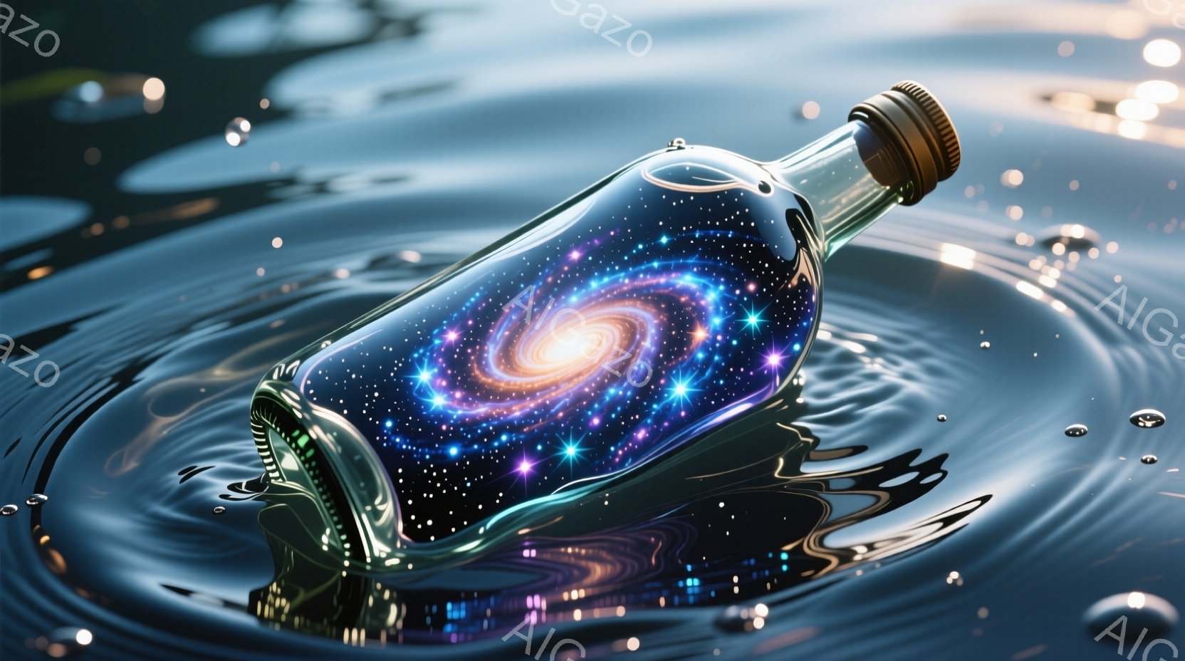深い青色の水面に、星雲を閉じ込めたガラス瓶が浮かんでいる。瓶の中の星雲は、渦巻く青、紫、白の光で満たされ、幻想的な光を放っている。水面には瓶の周囲に同心円状の波紋が広がり、神秘的で静謐な雰囲気を醸し出している。