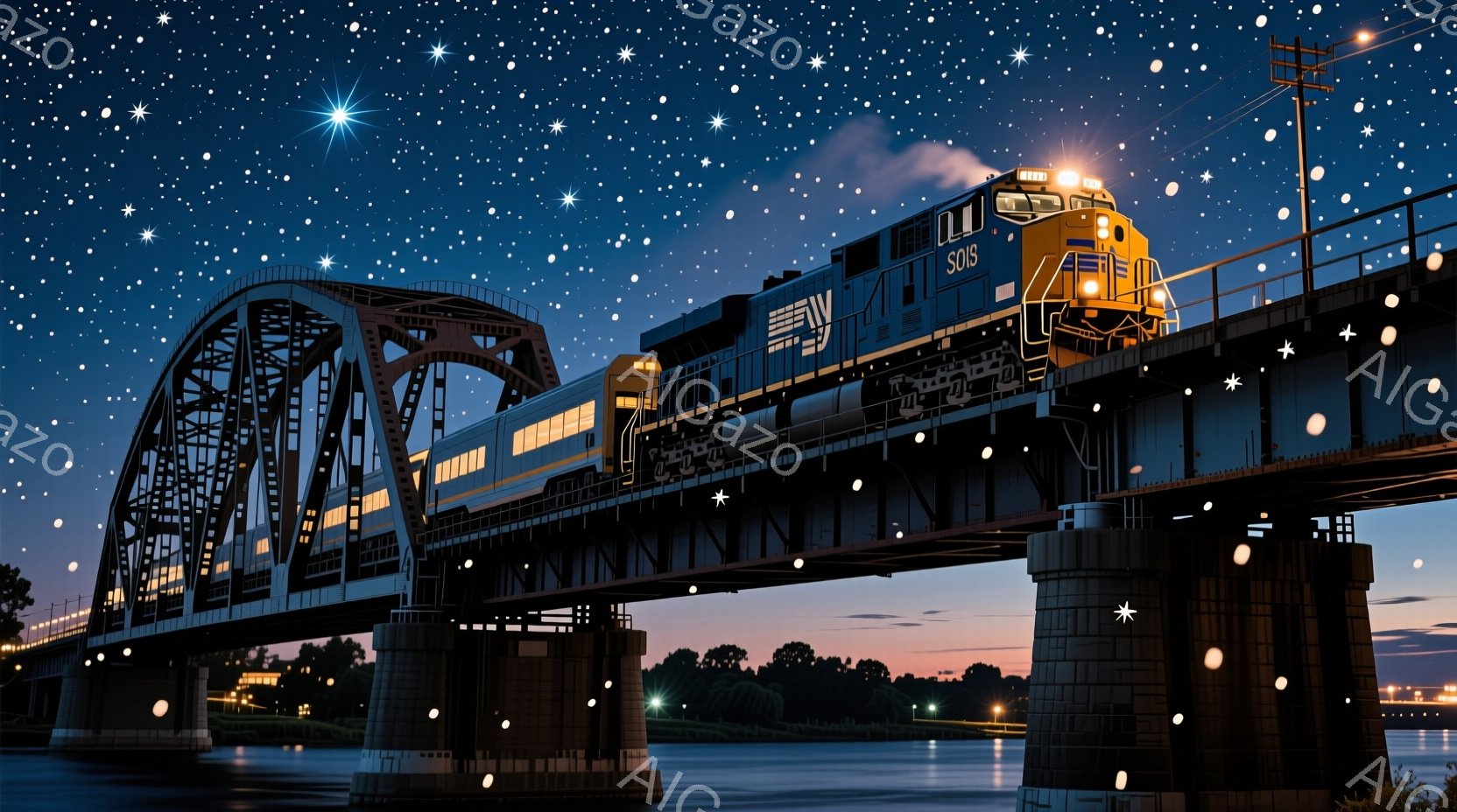 夜空を背景に、鉄道の橋を疾走する貨物列車が描かれています。列車は明るいヘッドライトを点灯し、煙を上げて進んでおり、橋の構造物は複雑な鉄骨で構成されています。夕暮れ時で、空は濃い青色からオレンジ色へと変化し、穏やかな水面が列車の影を映し出しています。