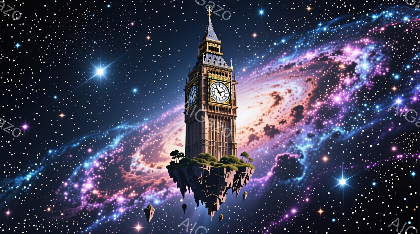 巨大なビッグ・ベンの塔が、星雲のような背景の中に浮かび上がっています。塔の下部はピクセル化されており、まるでブロックでできたように見え、一部分が崩れ落ちているような印象を与えます。背景はピンクと青の美しい星雲で、無数の星が輝き、幻想的な雰囲気を醸し出しています。