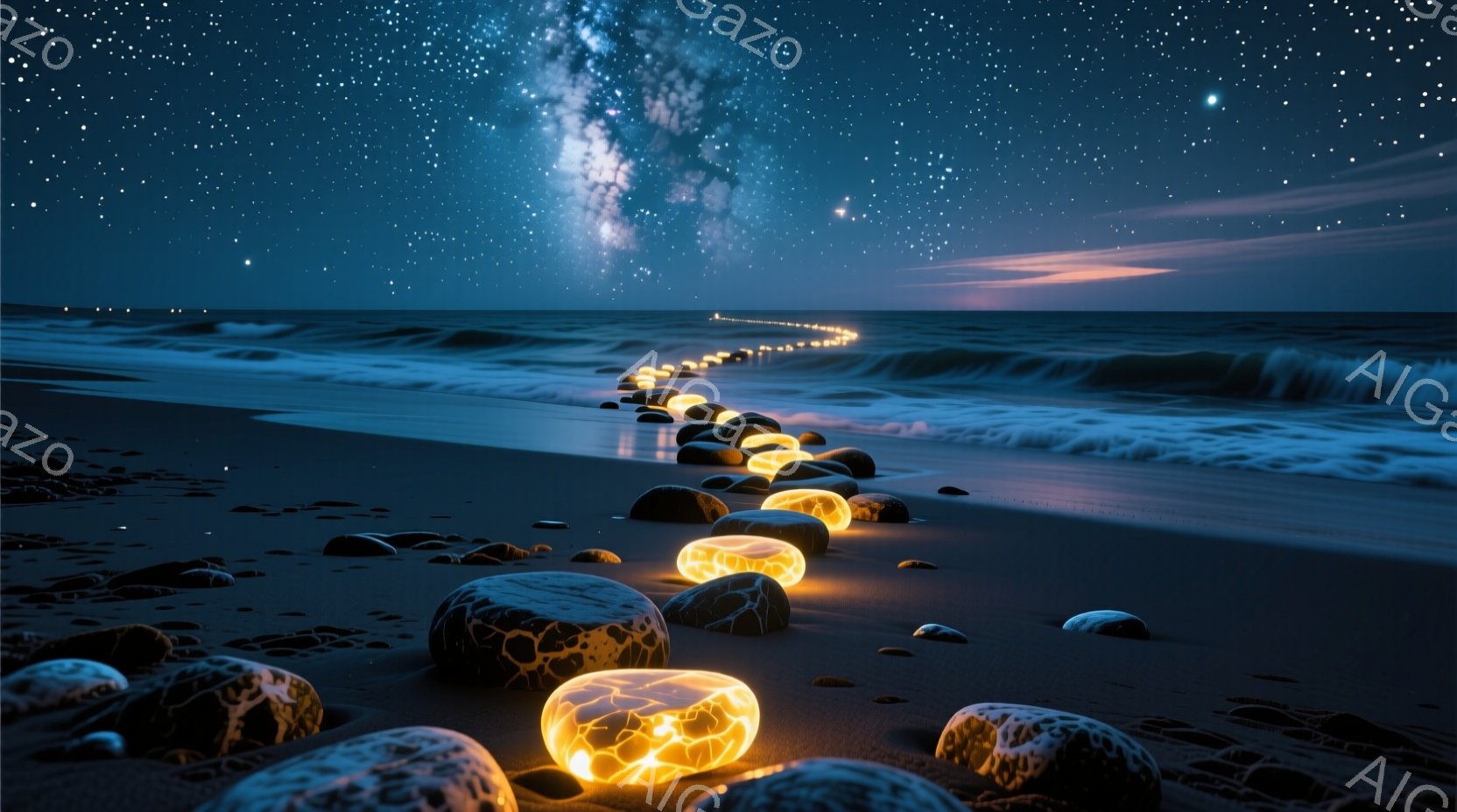 暗い砂浜に、発光する岩が並んで線状に続いており、まるで道標のようだ。背景には穏やかな波が打ち寄せ、星空が広がり、銀河がぼんやりと見える幻想的な光景が広がっている。全体的に静かで神秘的な雰囲気が漂い、夜の砂浜で幻想的な旅に出かけるような感覚を喚起する。