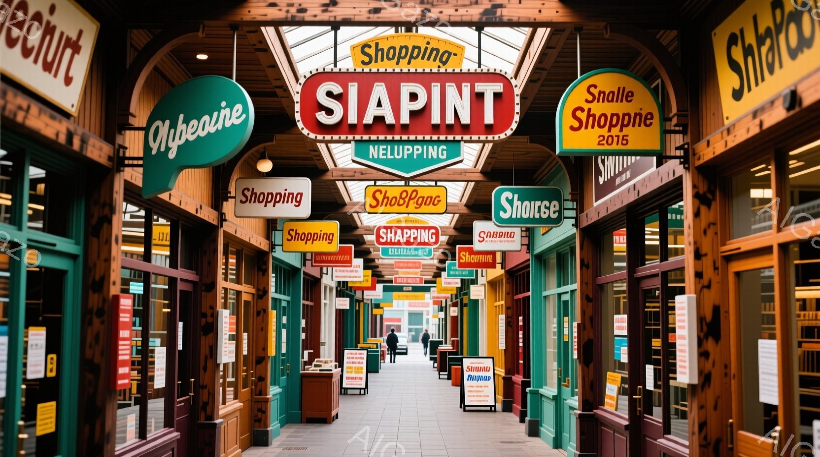 長いアーケードが、左右にカラフルな店舗が並び、遠くまで続いている。アーケードの上部には、さまざまな文字とデザインの看板が吊り下げられており、レトロで活気のある雰囲気を作り出している。奥には一人の人物が歩いており、通路に奥行きを与えている。