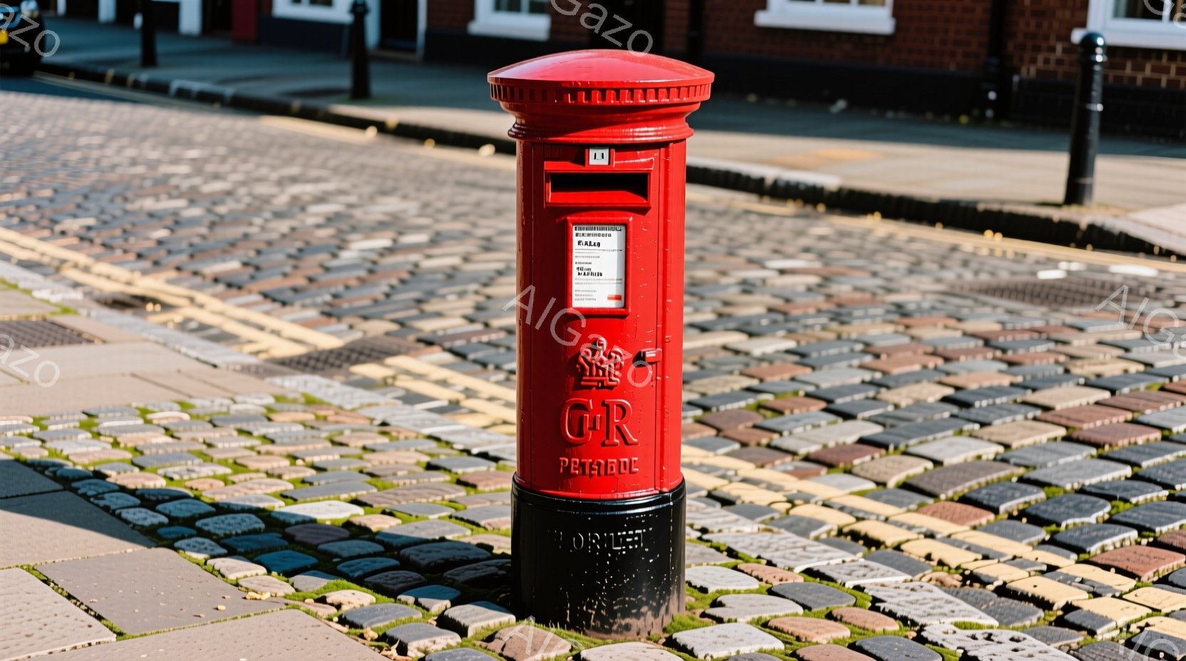 街路上のレッドポストボックスと舗道を示します。ボックスは地面に直立し、白書類が貼られています。舗道は平らかった縁で囲まれ、通りは見えません。周囲の建物は描写されておらず、天気も不明です。