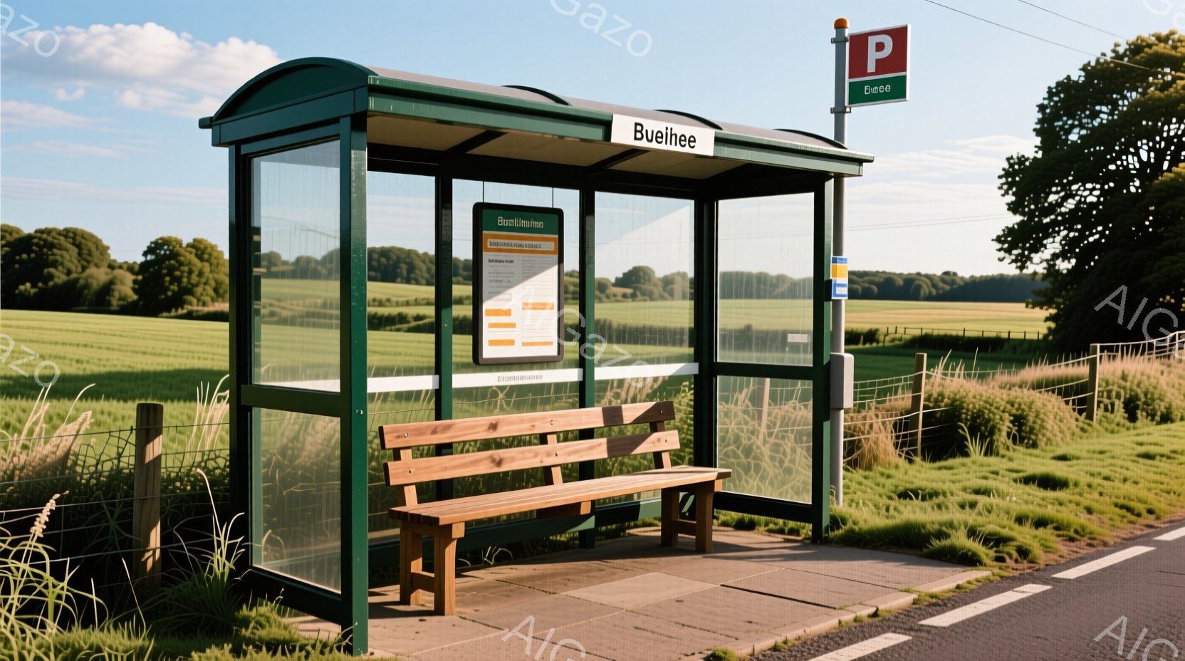 緑色の待合所が、田園風景の中に立っている。待合所の中には木製のベンチがあり、壁には時刻表のようなものが貼られている。周囲は緑の草地とフェンスで囲まれ、背景には穏やかな丘が見え、天候は晴れで、平和で静かな雰囲気が漂っている。