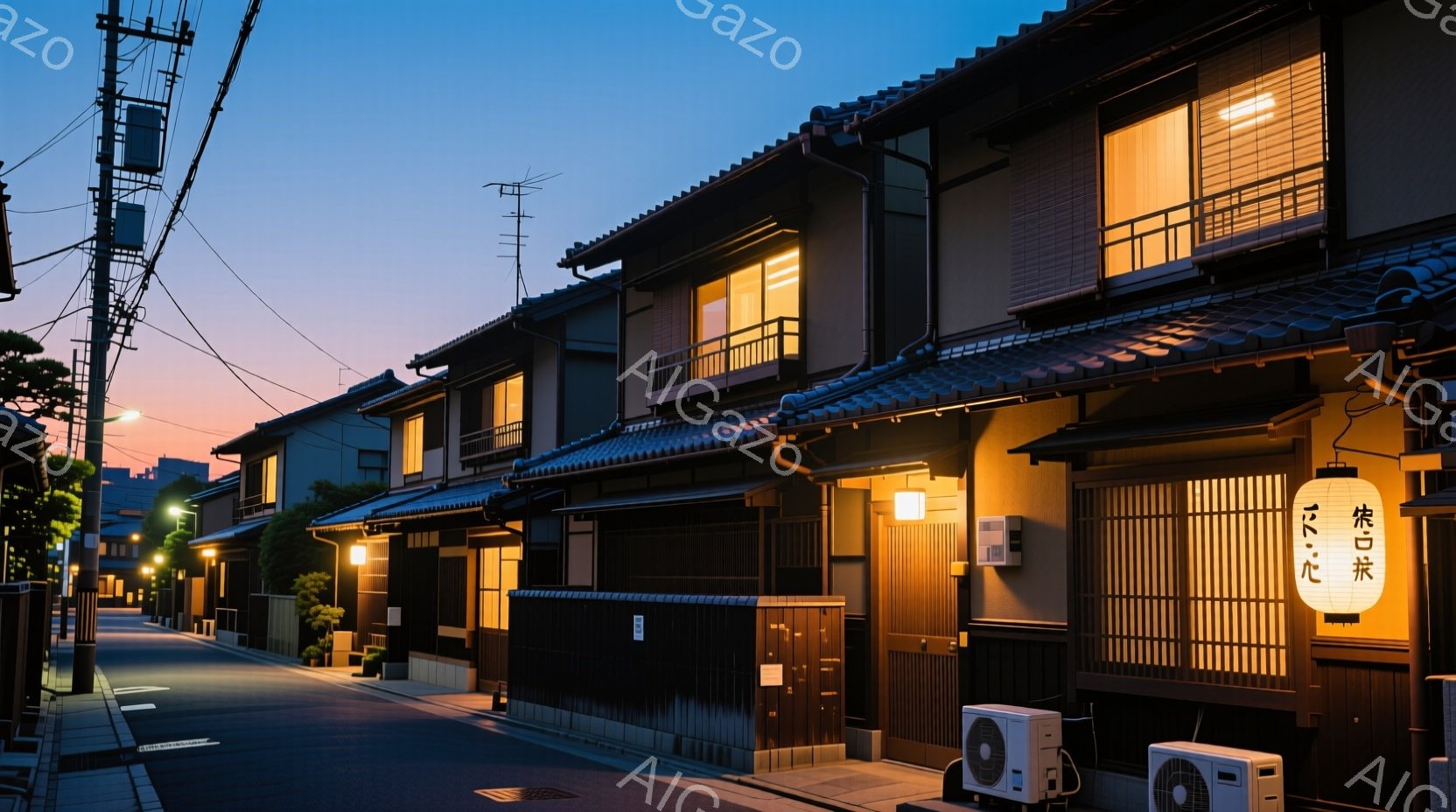 石畳の道が両側に古い木造家屋が並び、遠くには京都の塔がそびえ立っています。暖色の提灯や街灯が道を照らし、夜の静寂と歴史的な雰囲気を醸し出しています。家屋の窓からはぼんやりと光が漏れ、静かで落ち着いた夜の風景を描写しています。