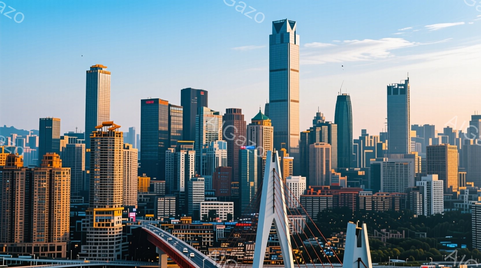 広大な都市景観が広がり、高層ビル群が空を切り裂くようにそびえ立っている。川が都市を横断し、緑豊かな公園と近代的なスタジアムが点在し、都市の景観に自然の要素を加えている。空はオレンジ色と青色が混ざり合い、穏やかで活気のある雰囲気を醸し出している。