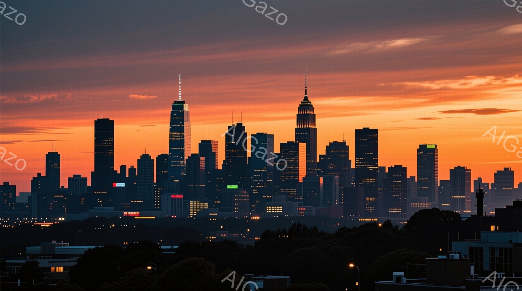 この無料AI生成画像「夕焼けに照らされたニューヨークのスカイラインを描いています。高層ビル群がシルエットとなり、その背後に広がる空はオレンジとピンクのグラデーションで彩られています。手前に広がる緑豊かな木々が、都市の風景に自然の要素を加えています。」は、2025年10月23日に作成されました。 サイズは 1664×928px の高解像度で、商用利用も可能なフリー素材として提供しています。