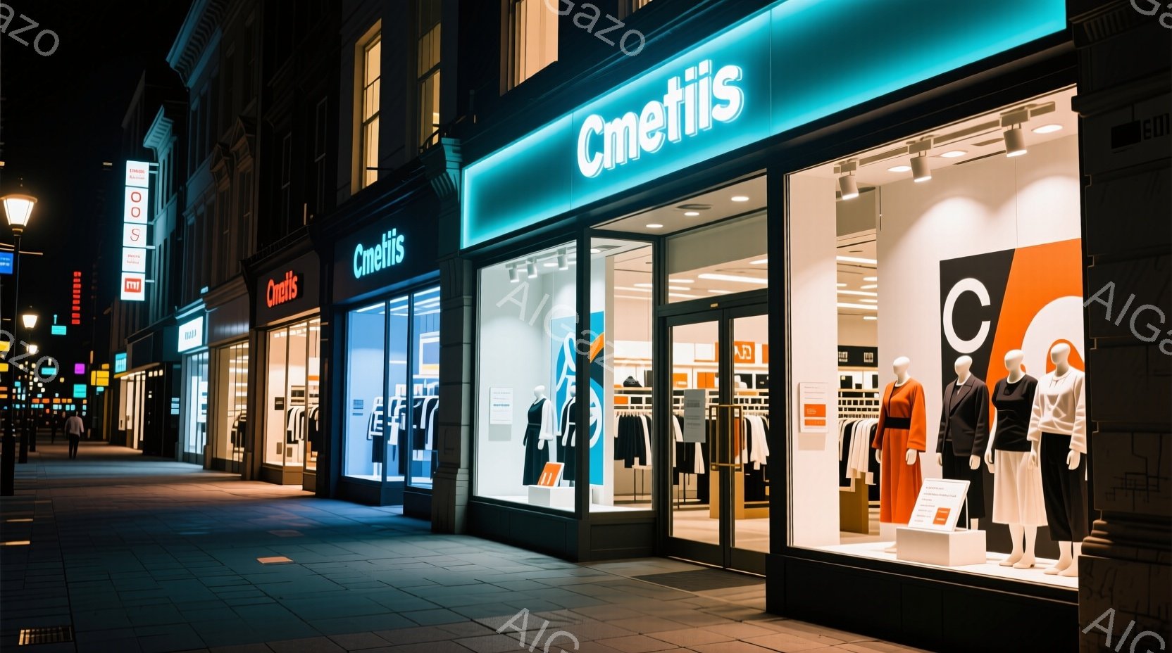 夜の街並みに、明るい青色のショーウィンドウが並ぶ衣料品店が映っている。ウィンドウには、様々な色の服が整然と並べられており、店内は暖かく照らされている。歩道は濡れており、遠くには人影が見え、静かで落ち着いた夜の雰囲気が漂っている。
