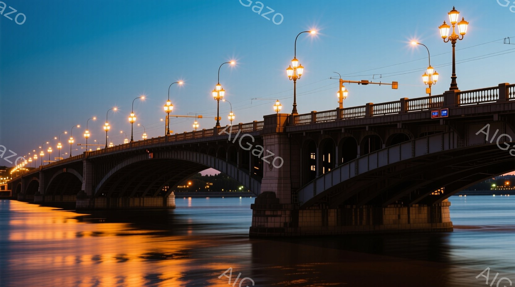 穏やかな水面に映るアーチ型の橋が印象的な風景です。橋の上にはレトロなデザインの街灯が並び、夕暮れ時の空と水面に暖かな光を反射しています。背景には緑豊かな自然が広がり、静かで平和な雰囲気を醸し出しています。