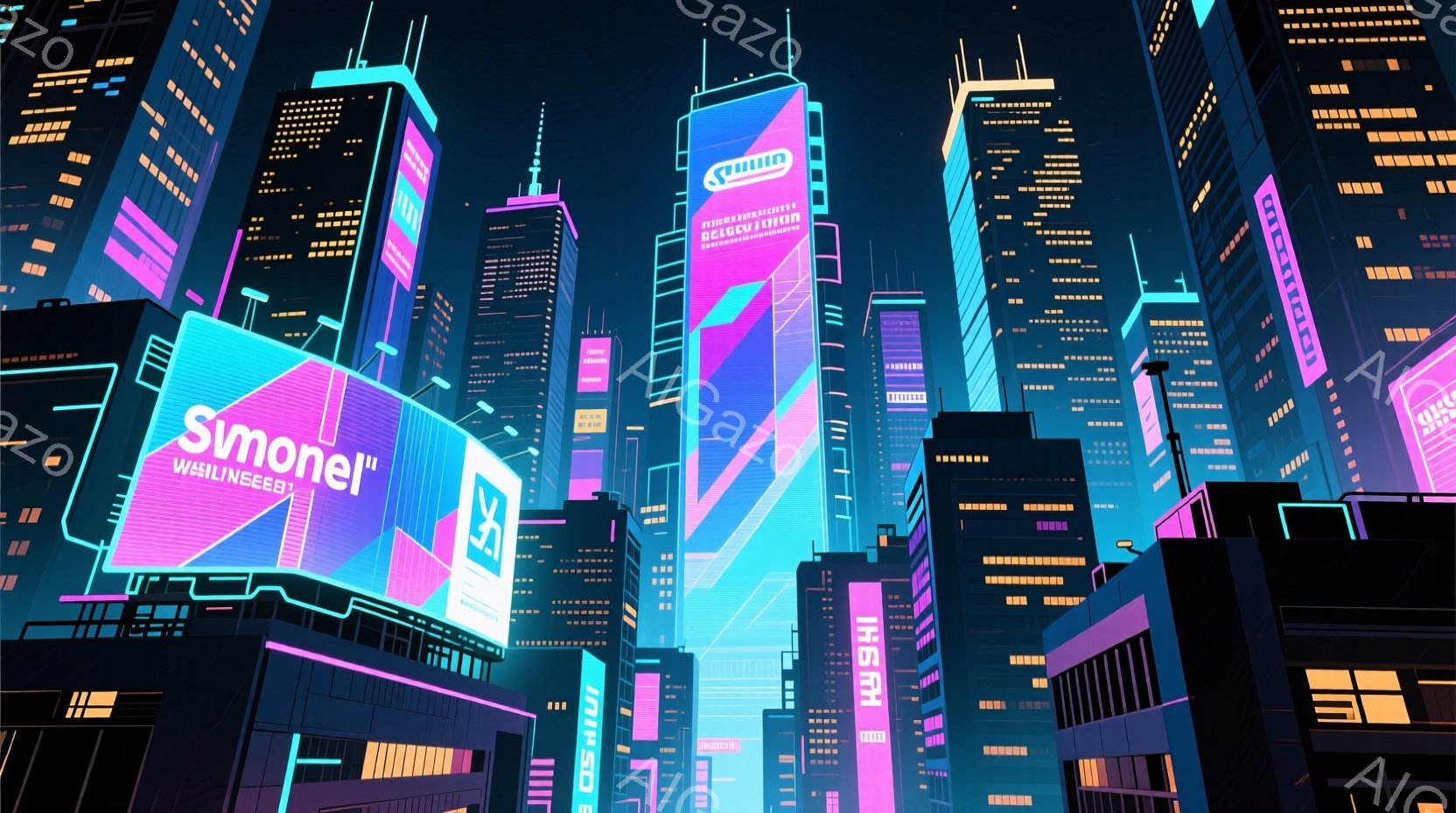ネオン輝く未来都市の夜景が描かれている。高層ビル群には様々な広告が映し出され、人々は通りを歩いたり車を運転したりしている。全体的にサイバーパンク風の鮮やかで活気のある雰囲気である。