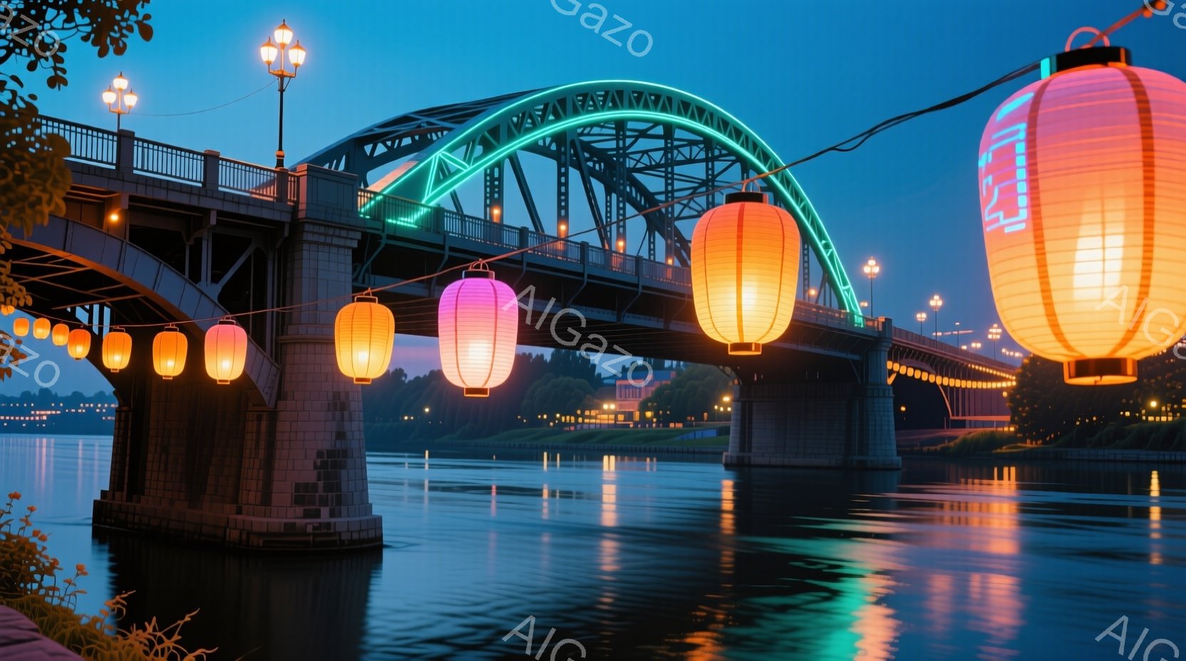 夜空の下、川の上にカラフルな提灯が連なり、美しい光景を作り出している。川面には提灯の光が反射し、水面もまた輝いている。背景には橋が聳え立ち、静かで幻想的な雰囲気を醸し出している。