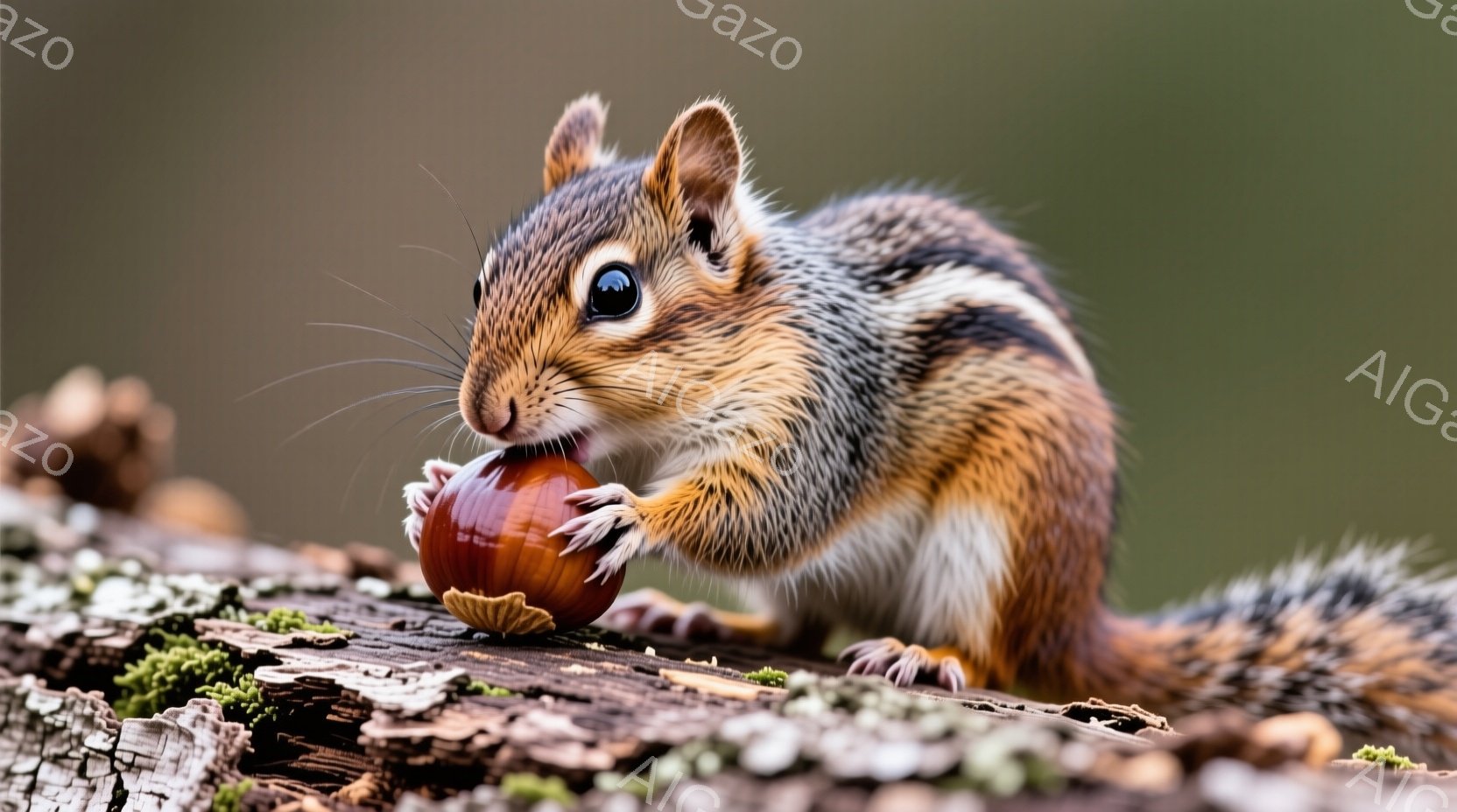 リスが木の枝にとまり、茶色の殻を持つどんぐりを前足で抱えています。そのリスはオレンジと白の毛並みで、つぶらな瞳が特徴的です。背景はぼやけており、緑豊かな自然の中にいることを示唆しています。
