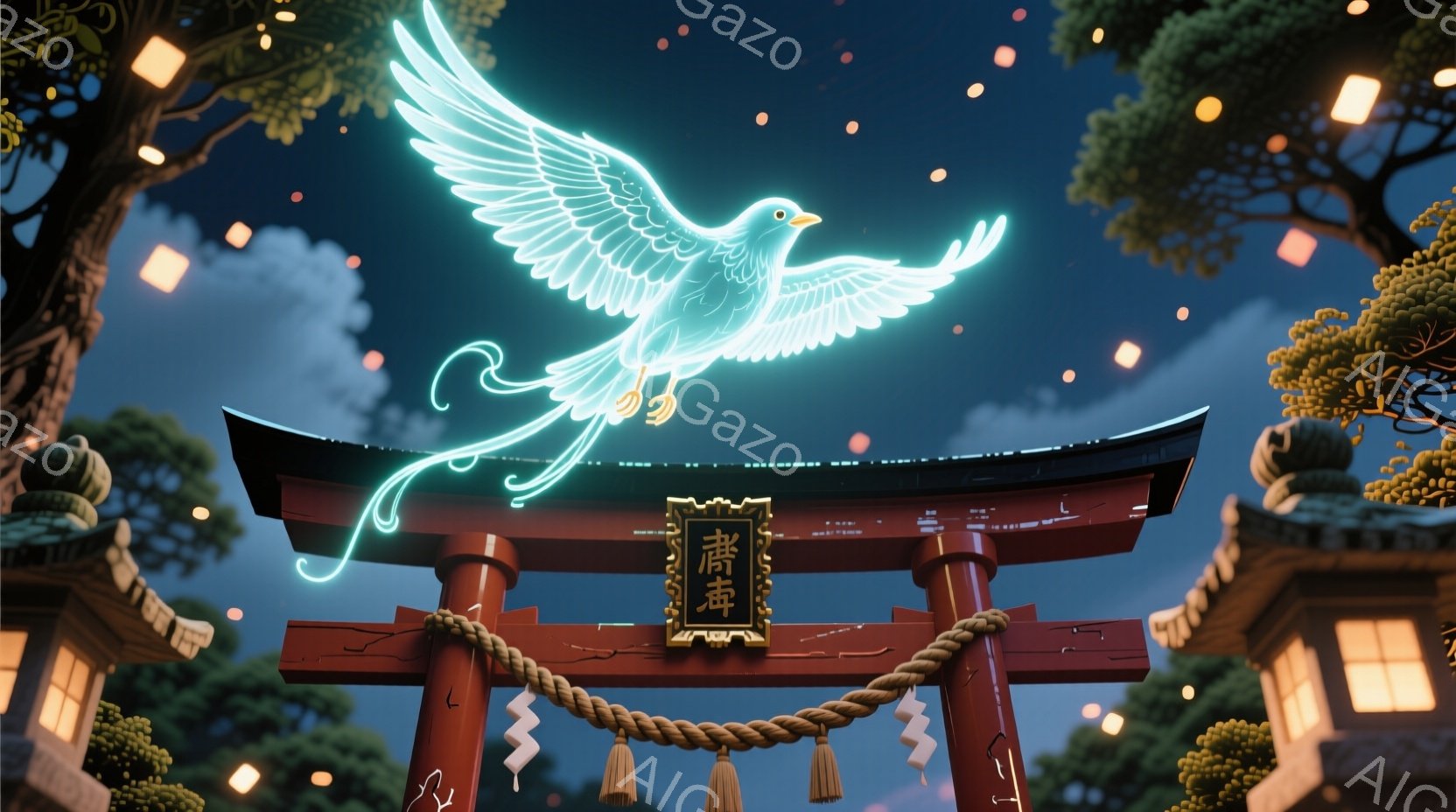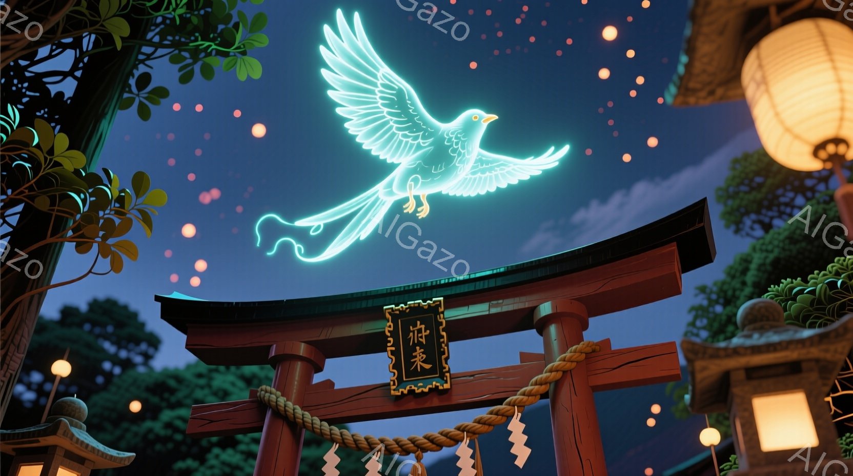 鮮やかな朱色の鳥居が画面中央に位置し、その上に光り輝く青い鳥が羽を広げて飛んでいます。背景には暗緑色の木々が生い茂り、鳥居の周りには提灯が灯り、幻想的な夜の雰囲気を醸し出しています。全体的に神秘的で静謐な印象を与える、美しい風景画です。