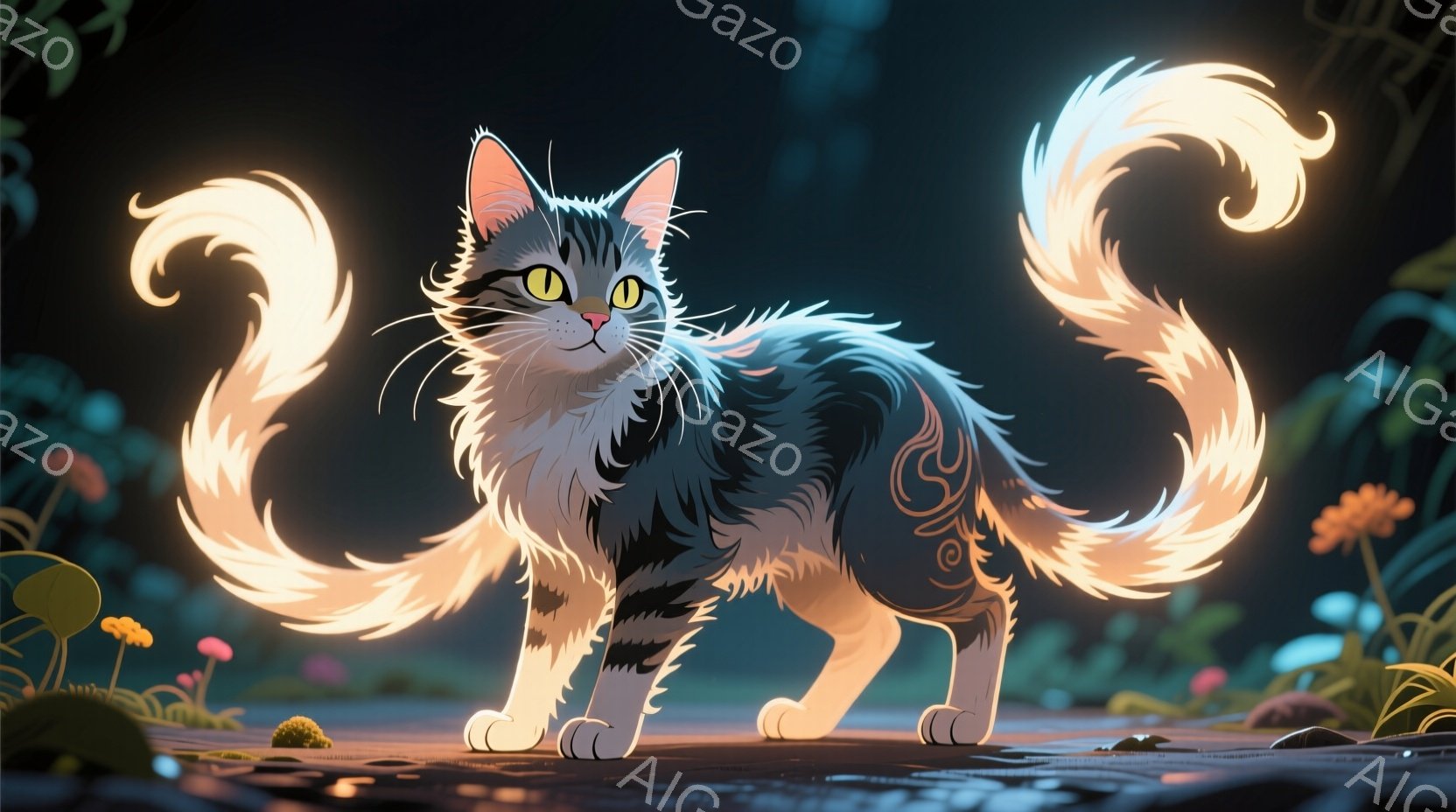 黒と白の猫が、輝く尾を持つ状態で座っています。背景は暗く、ぼやけた緑の植物がわずかに見え、幻想的な雰囲気を醸し出しています。猫の表情は穏やかで、神秘的な光の尾が特徴的です。