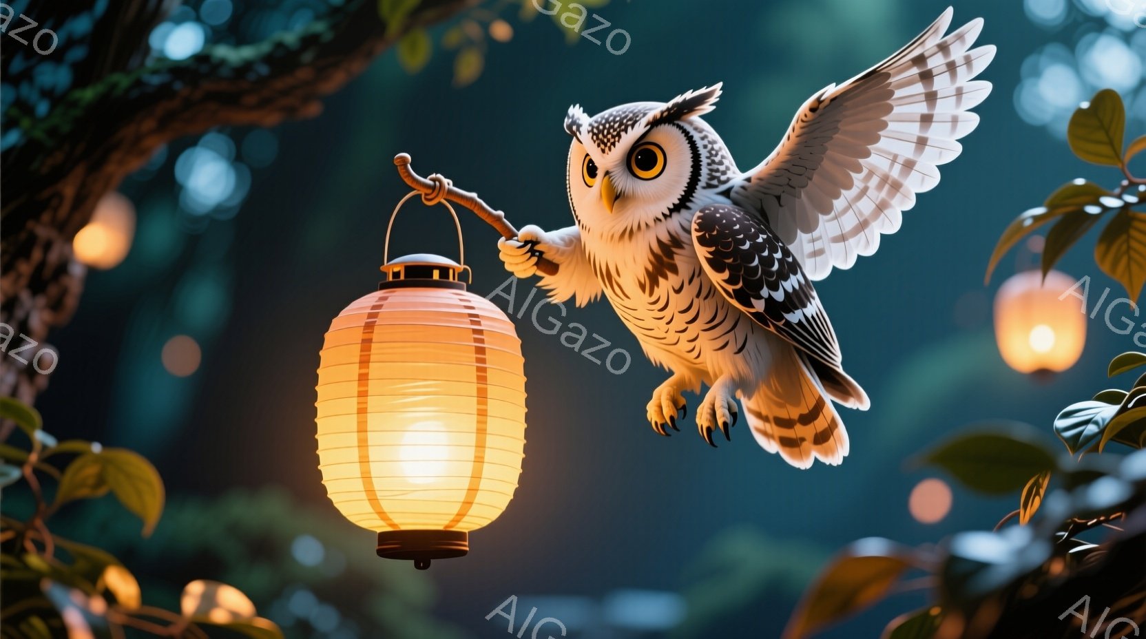 白いフクロウが、光る提灯をくわえて夜空を飛んでいる様子が描かれています。背景には緑豊かな植物や花が咲き乱れ、他の提灯が点在しており、幻想的な雰囲気を醸し出しています。フクロウは好奇心旺盛な表情で、夜の森を照らす光を運び、夢のような世界へと誘います。