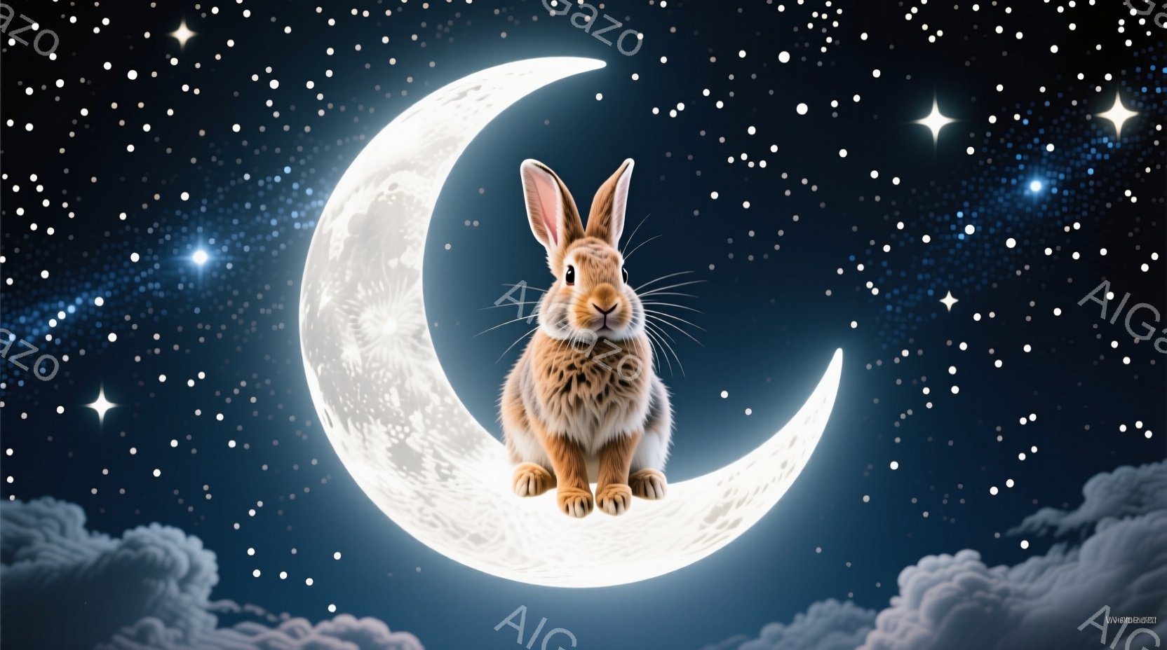 明るい満月のクレセント状の表面に、茶色の毛並みのウサギが座っています。ウサギは前足を揃えて座り、好奇心と穏やかな表情で正面を見つめています。背景は暗く、星が散りばめられた夜空で、夢のような静かで神秘的な雰囲気を醸し出しています。