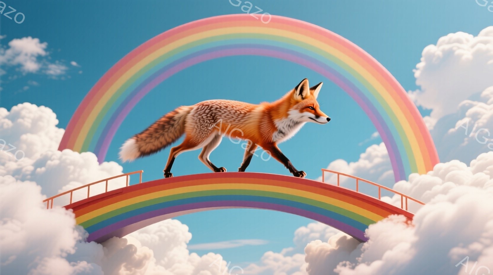 明るい虹のアーチを堂々と歩く、鮮やかなオレンジ色のキツネが描かれています。キツネは自信に満ちた表情で、ふわふわとした毛並みが特徴的です。背景には柔らかい雲が広がり、青空とのコントラストが美しい、幻想的な雰囲気の画像です。