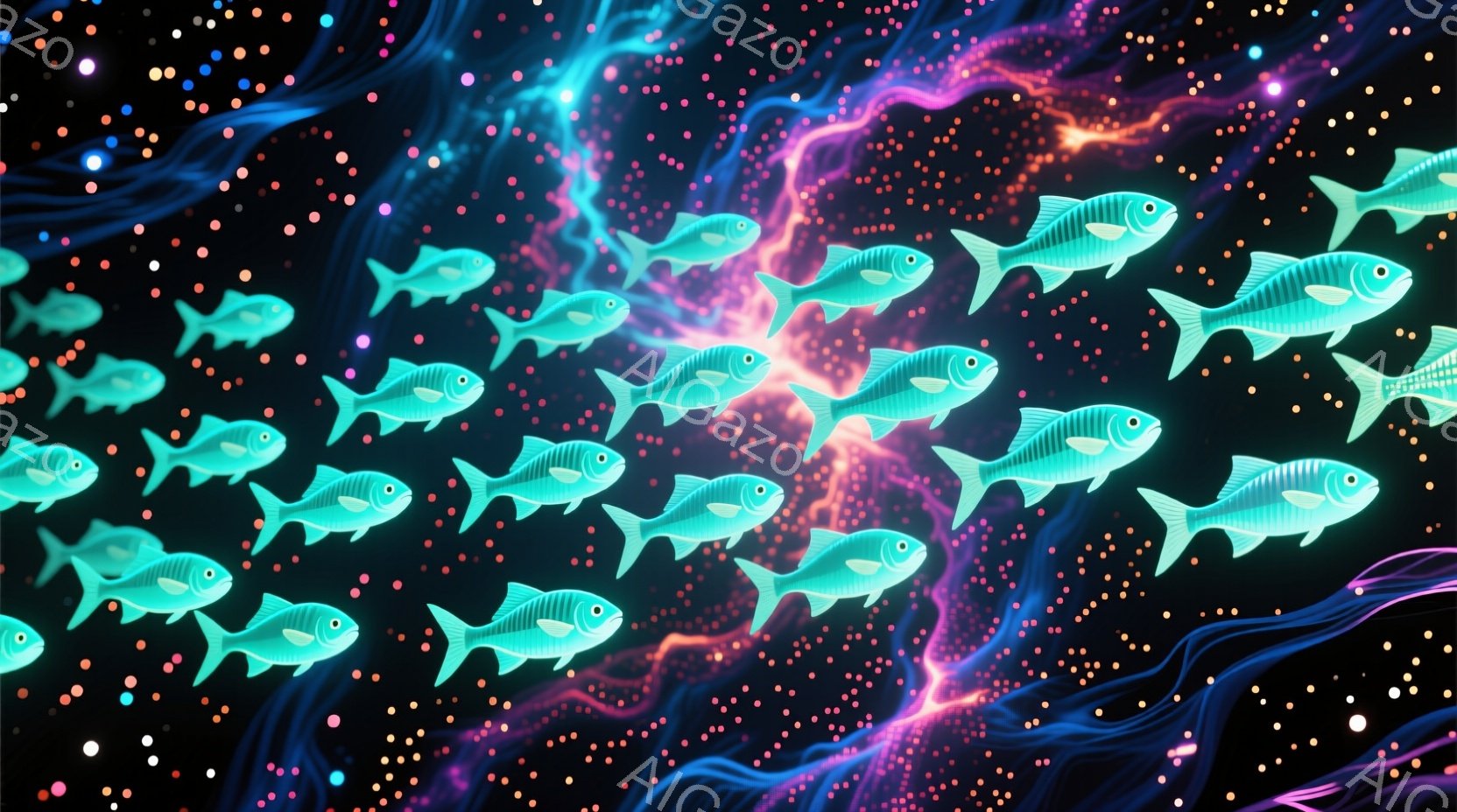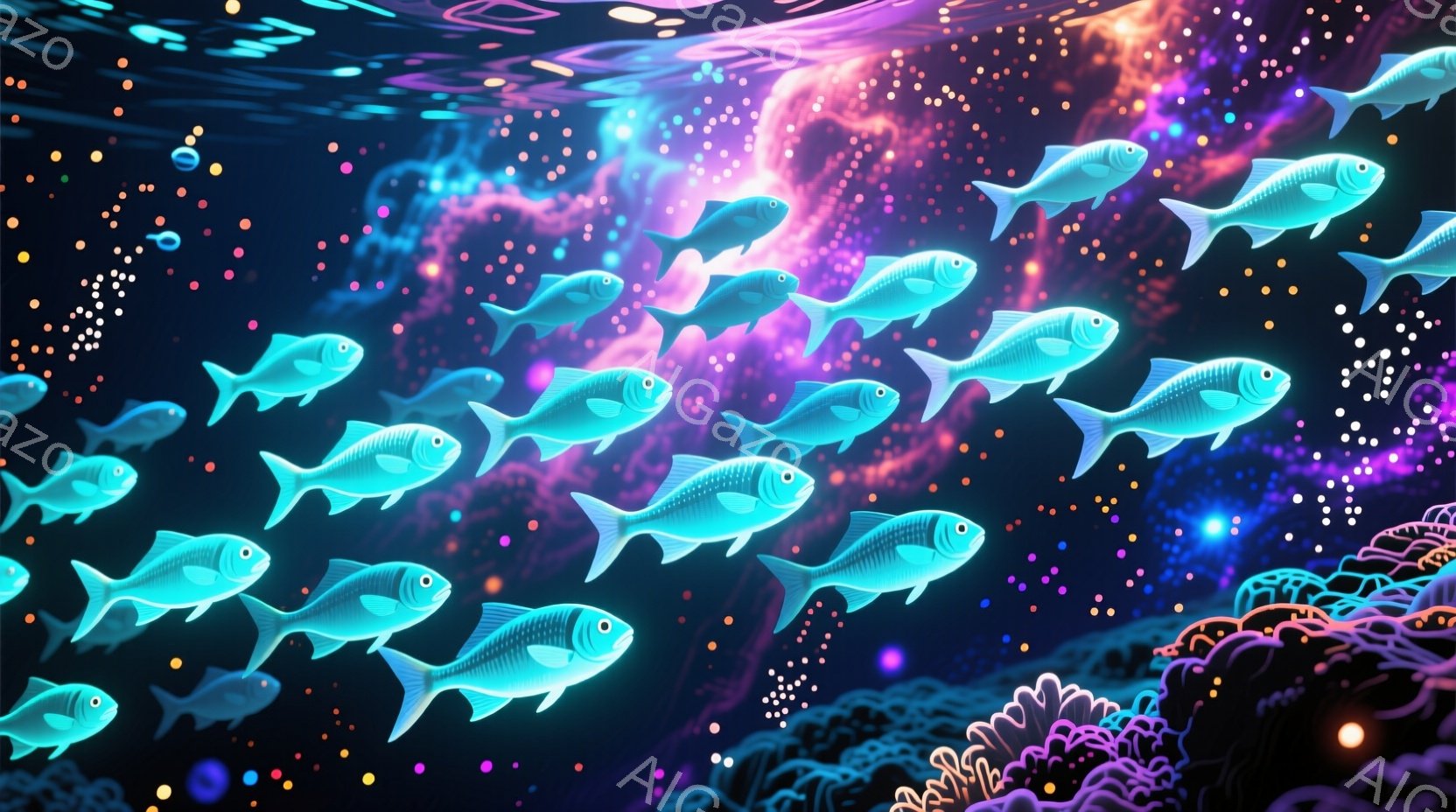 深い黒色の背景に、鮮やかなターコイズブルーの魚が群れをなして泳いでいる様子が描かれています。背景には、ピンクと紫の渦巻く雲のような模様が広がり、星のような光が散りばめられています。全体的に幻想的で神秘的な雰囲気を醸し出しており、まるで深海や宇宙空間を思わせるような光景です。