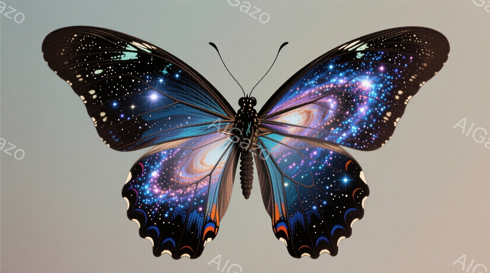 鮮やかな色彩で彩られた巨大な蝶が、広げた翼を画面いっぱいに表示されている。翼は銀河や星雲を思わせる、紫、青、ピンク、オレンジ色の光の渦巻で構成されており、神秘的で幻想的な雰囲気を醸し出している。背景は黒く、無数の星が輝いており、蝶の幻想的な美しさをさらに際立たせている。