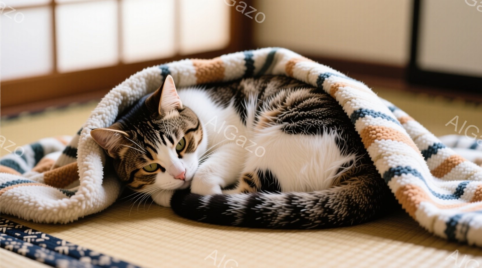 白と茶色の縞模様の猫が畳の上に丸まって眠っています。猫は毛布に包まれ、リラックスした表情で穏やかな時間を過ごしているようです。背景には日本の伝統的な部屋の一部が見え、温かく落ち着いた雰囲気を醸し出しています。