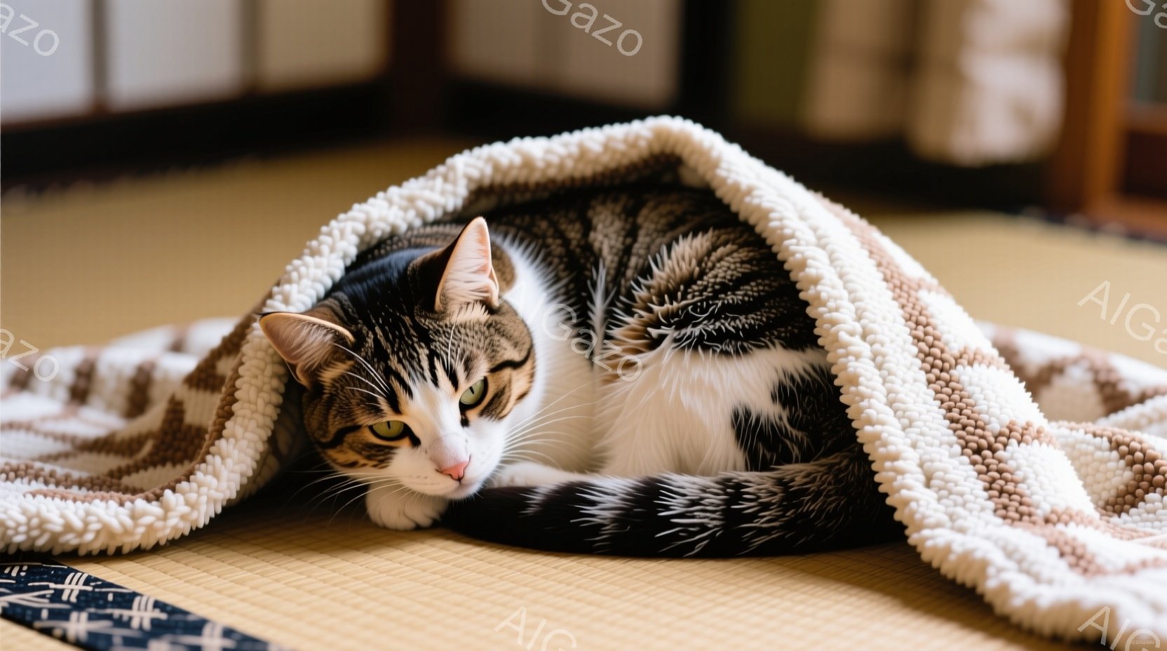 白と黒の縞模様の猫が、ベージュと黒の編み物のブランケットに包まれて畳の上に丸まって眠っています。猫は目を細め、リラックスした表情で、毛並みはふっくらとして暖かそうです。背景には、日本の伝統的な障子が見え、室内は穏やかで静かな雰囲気が漂っています。