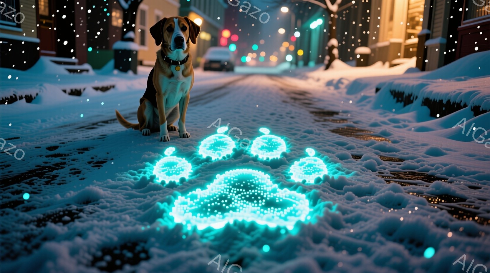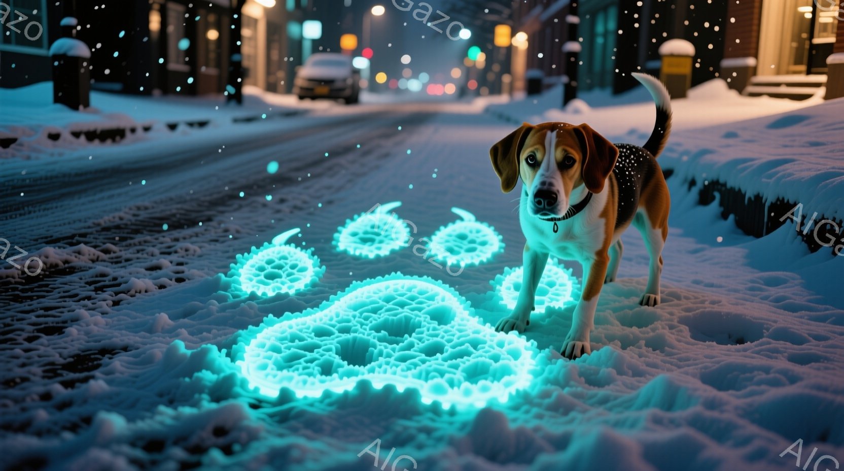 雪が降る夜の街並みの中に、光る青い輪の中に黒いダックスフンドが描かれている。道路には雪が積もり、街灯や車のライトがぼんやりと光っている。全体的に幻想的で、冬の夜の静けさと、ダックスフンドのシルエットが印象的な光景である。