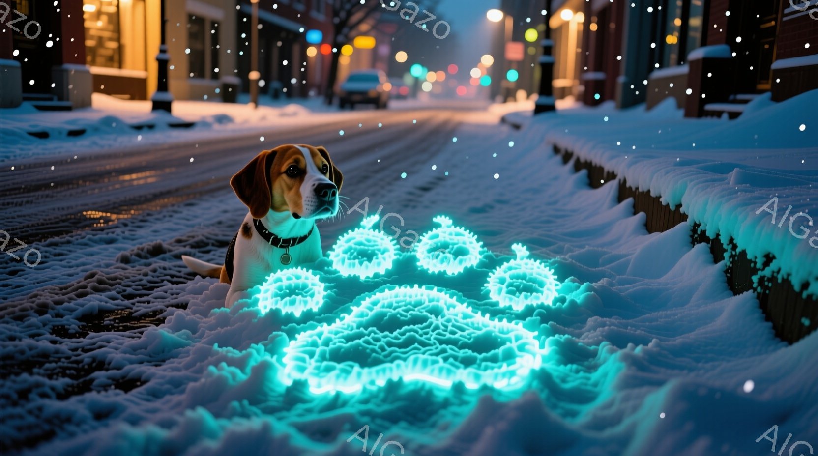 雪が降る夜の街並みを背景に、茶色と白の毛並みを持つ犬が前足を揃えて座っている。犬の足元には、青白い光を放つ足跡の模様が雪の上に浮かび上がっており、幻想的な雰囲気を醸し出している。背景にはぼやけた街灯や建物の光が見え、冬の夜の静けさと暖かさが感じられる。